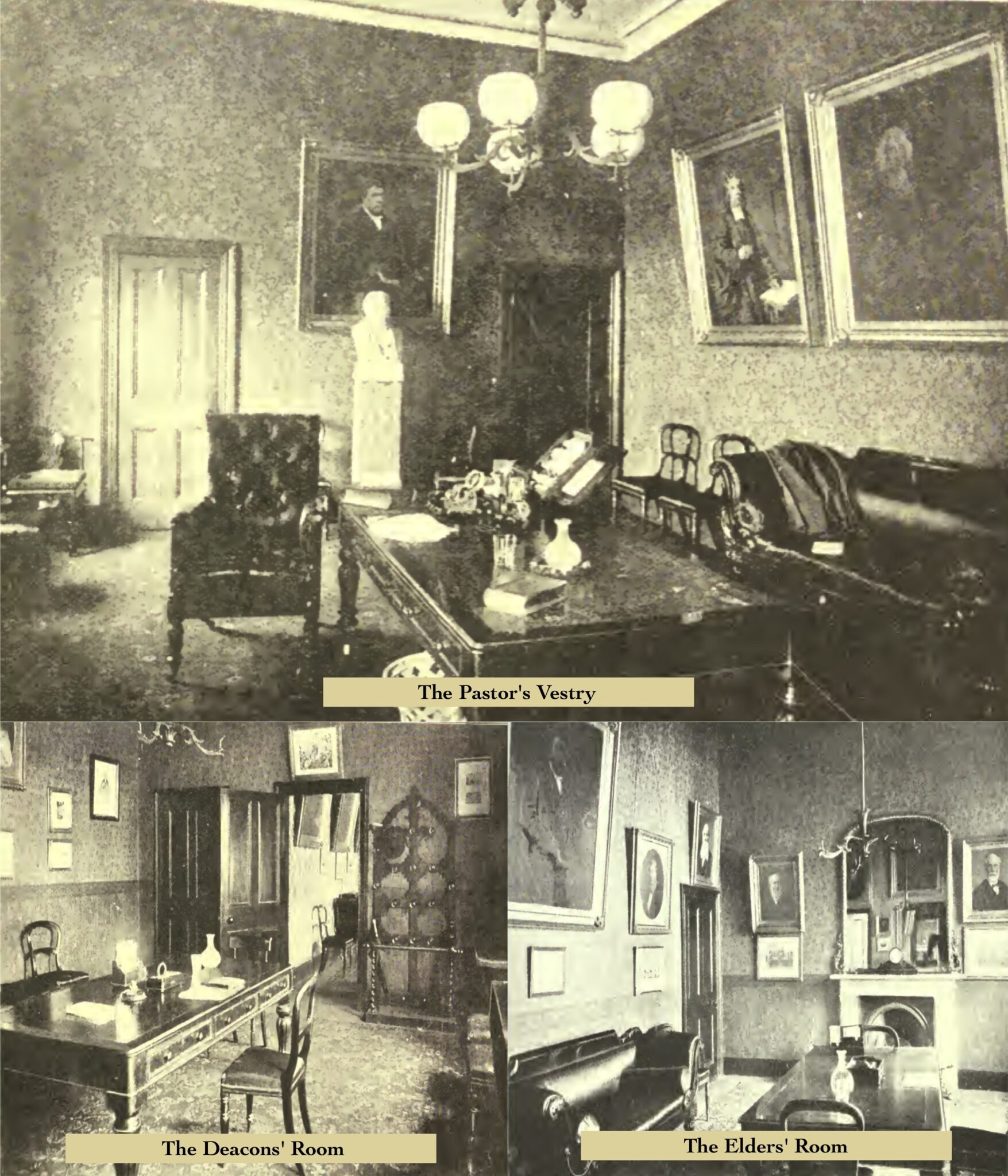 “Behind the upper platform, there are three spacious rooms; in the centre, is the minister’s vestry; to the right and left, are the rooms of the deacons and elders,—the officers of the army on either side of the captain, so that they may be ready to go forward at the word of command. Then above them, on the third story, there are three other excellent rooms, to be used for tract and Bible depositories, and for other schemes which we hope the church will undertake.”[25]