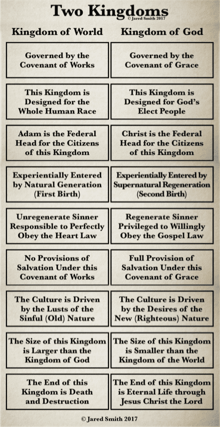 To keep one’s self unspotted FROM the world, suggests there is another world to which he belongs. Of course, this brings us back to the two kingdoms—each kingdom is governed by a different covenant; each kingdom is designed for a particular group of people; each kingdom is represented by a different federal head; each kingdom is experientially entered by a different birth; each kingdom is administered by a different law; each kingdom is restricted in its provisions for salvation; each kingdom is distinguished by a different culture; each kingdom has a measurable population; each kingdom is fitted for a certain end.