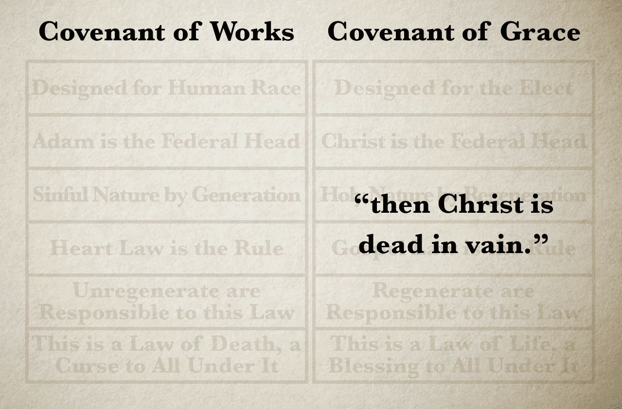 The word “frustrate” means to obstruct, hinder or exasperate; the expression “grace of God” is a reference to the Covenant of Grace (Gospel Law included). So, Paul is saying, “I will not obstruct, hinder or exasperate the Gracious Covenant, by running back over to the Covenant of Works; I will not stop, block or hamper the Gospel Law, by bringing myself back under the Heart Law.” Why?