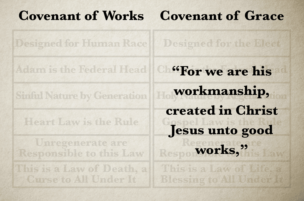 The new nature imparted to the soul is the intricate work of the Holy Spirit. He has fearfully, wonderfully and curiously wrought a new nature in the soul, which after God is created in righteousness and true holiness.” (Eph 4:24) The good works of the believer are therefore inseparable from his union with Christ—for without Christ, the believer can do nothing. However, it may be asked, if the believer is no longer under the Heart Law, yet he is created in Christ Jesus unto good works, does this mean the commandments of the Heart Law are nullified—i.e., loving God supremely and loving one’s neighbor as himself are invalidated? No, for although the believer’s good works are not in opposition to the Heart Law (for this is a holy, just and good law), yet they are of a higher order than the Heart Law (for at the heart of the Gospel Law is Christ). Here is a simple comparison between the two Laws: