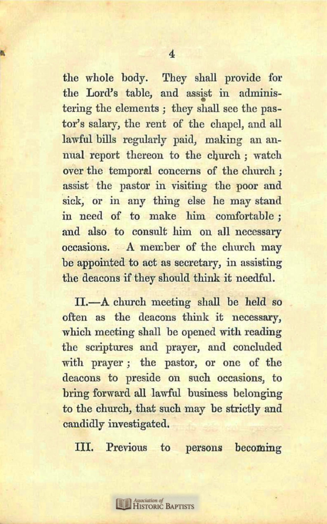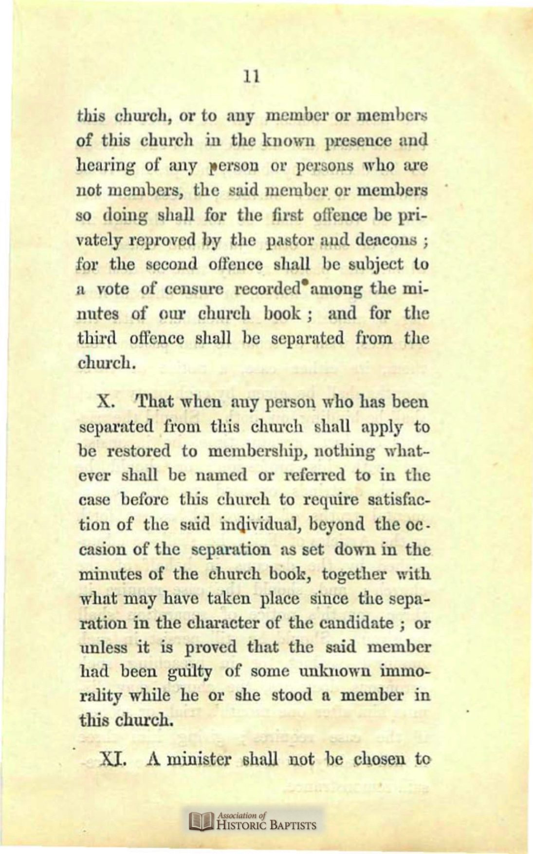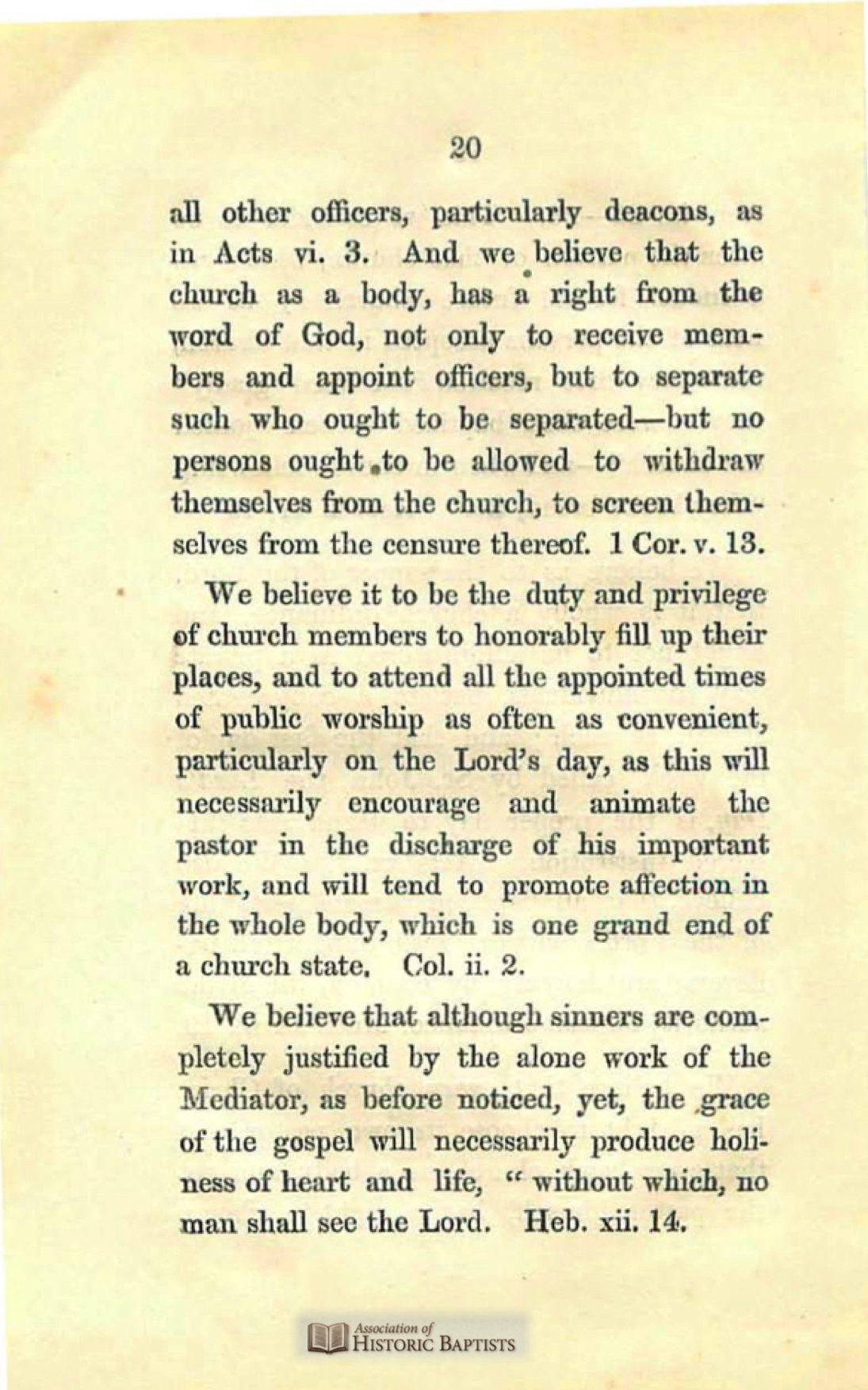 We believe that every church of Christ has a right to choose its own pastor, and that every such church, as a body, and not the pastor himself, has a right to choose all other officers, particularly deacons, as in Acts 6:3. And we believe that the church as a body, has a right from the word of God, not only to receive members and appoint officers, but to separate such who ought to be separated—but no persons ought to be allowed to withdraw themselves from the church, to screen themselves from the censure thereof. 1 Cor. 5:13.