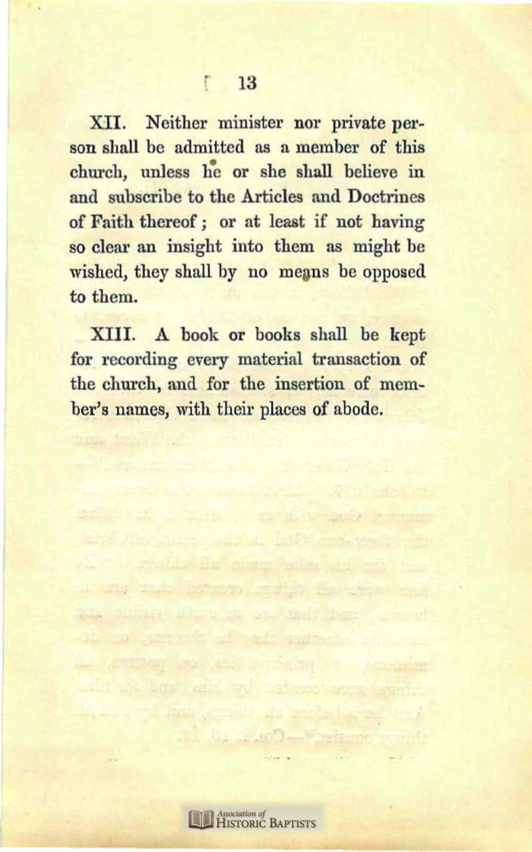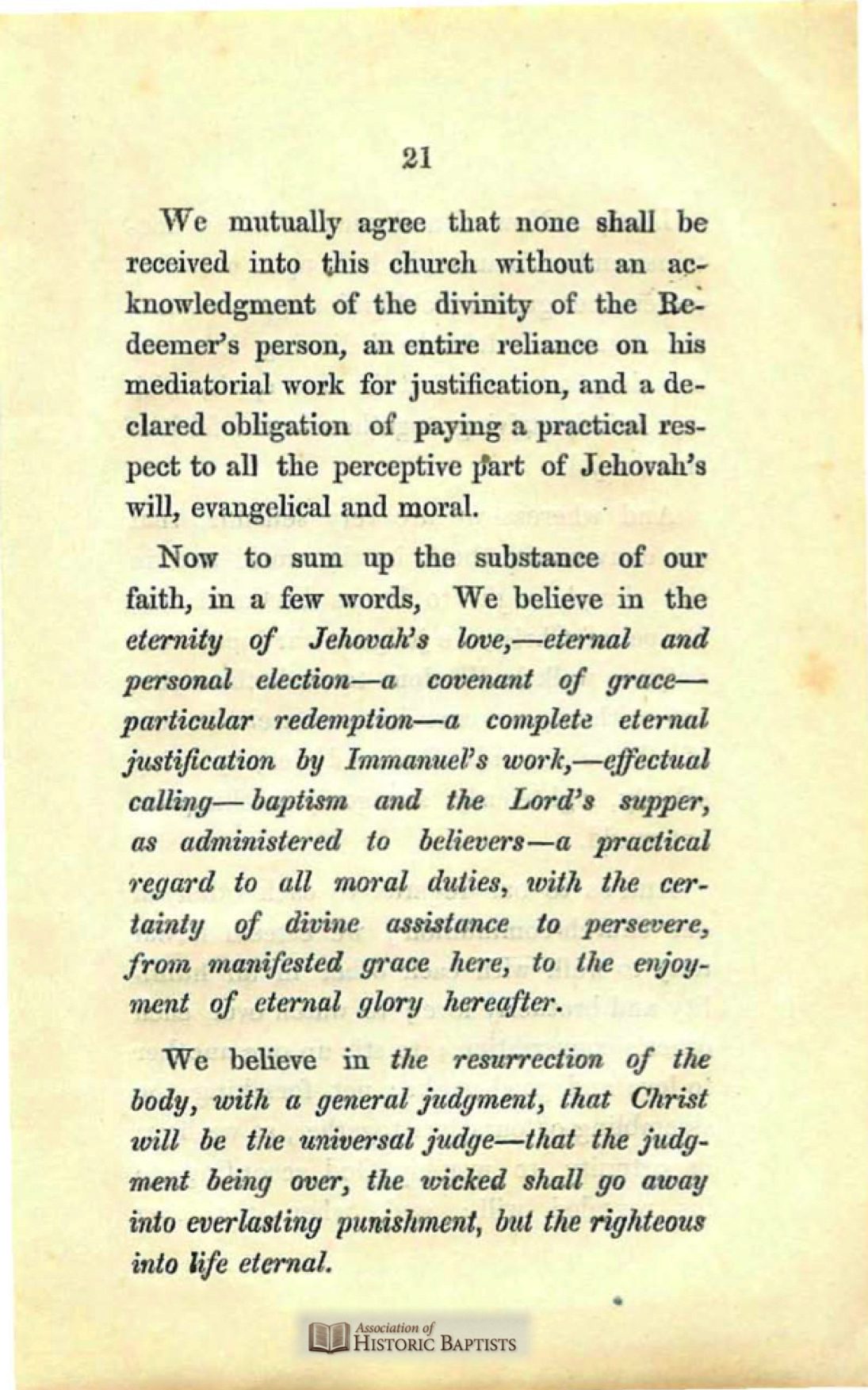 We mutually agree that none shall be received into this church without an acknowledgment of the divinity of the Redeemer’s person, an entire reliance on his mediatorial work for justification, and a declared obligation of paying a practical respect to all the perceptive part of Jehovah’s will, evangelical and moral.