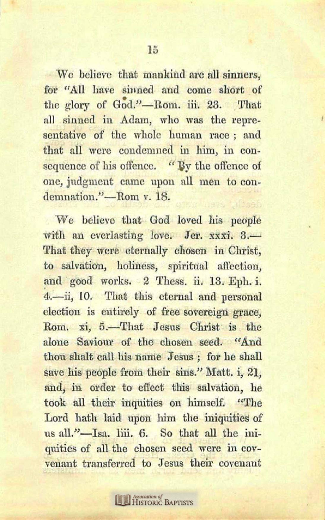 We believe that God loved his people with an everlasting love. Jer. 31:3 —That they were eternally chosen in Christ, to salvation, holiness, spiritual affection, and good works. 2 Thess. 2:13. Eph. 1:4.—2:10. That this eternal and personal election is entirely of free sovereign grace, Rom. 11:5.—That Jesus Christ is the alone Saviour of the chosen seed. “And thou shalt call his name Jesus; for he shall save his people from their sins.” Matt. 1:21, and, in order to effect this salvation, he took all their iniquities on himself. “The Lord hath laid upon him the iniquities of us all.”—Isa. 53:6. So that all the iniquities of all the chosen seed were in covenant transferred to Jesus their covenant head; and that this covenant and all that appertains to it, shall stand fast with him for ever. Psalm 89:28.”