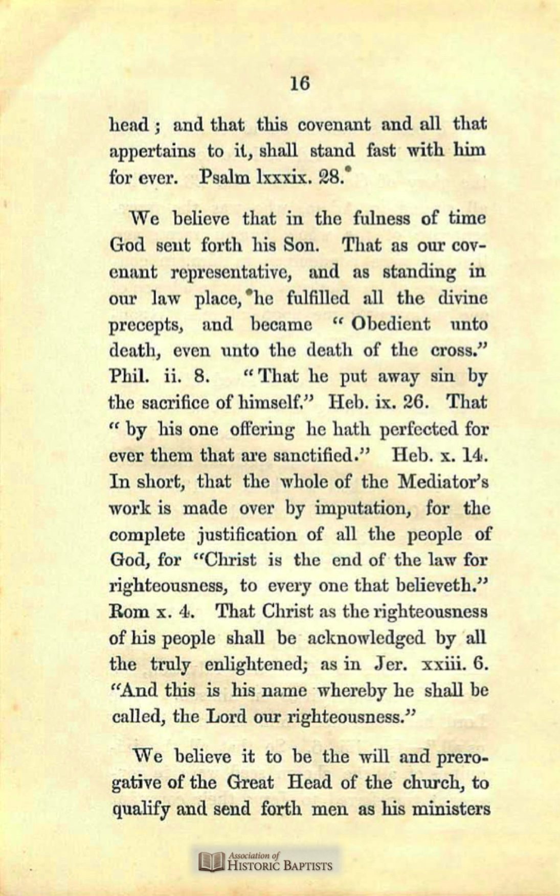 We believe that in the fulness of time God sent forth his Son. That as our covenant representative, and as standing in our law place, he fulfilled all the divine precepts… and became “Obedient unto death, even unto the death of the cross.” Phil. 2:8. “That he put away sin by the sacrifice of himself.” Heb. 9:26. That “by his one offering he hath perfected for ever them that are sanctified.” Heb. 10:14. In short, that the whole of the Mediator’s work is made over by imputation, for the complete justification of all the people of God. for “Christ is the end of the law for righteousness to everyone that believeth.” Rom 10:4. That Christ as the righteousness of his people shall be acknowledged by all the truly enlightened; as in Jer. 23:6. “And this is his name whereby he shall be called, the Lord our righteousness.”