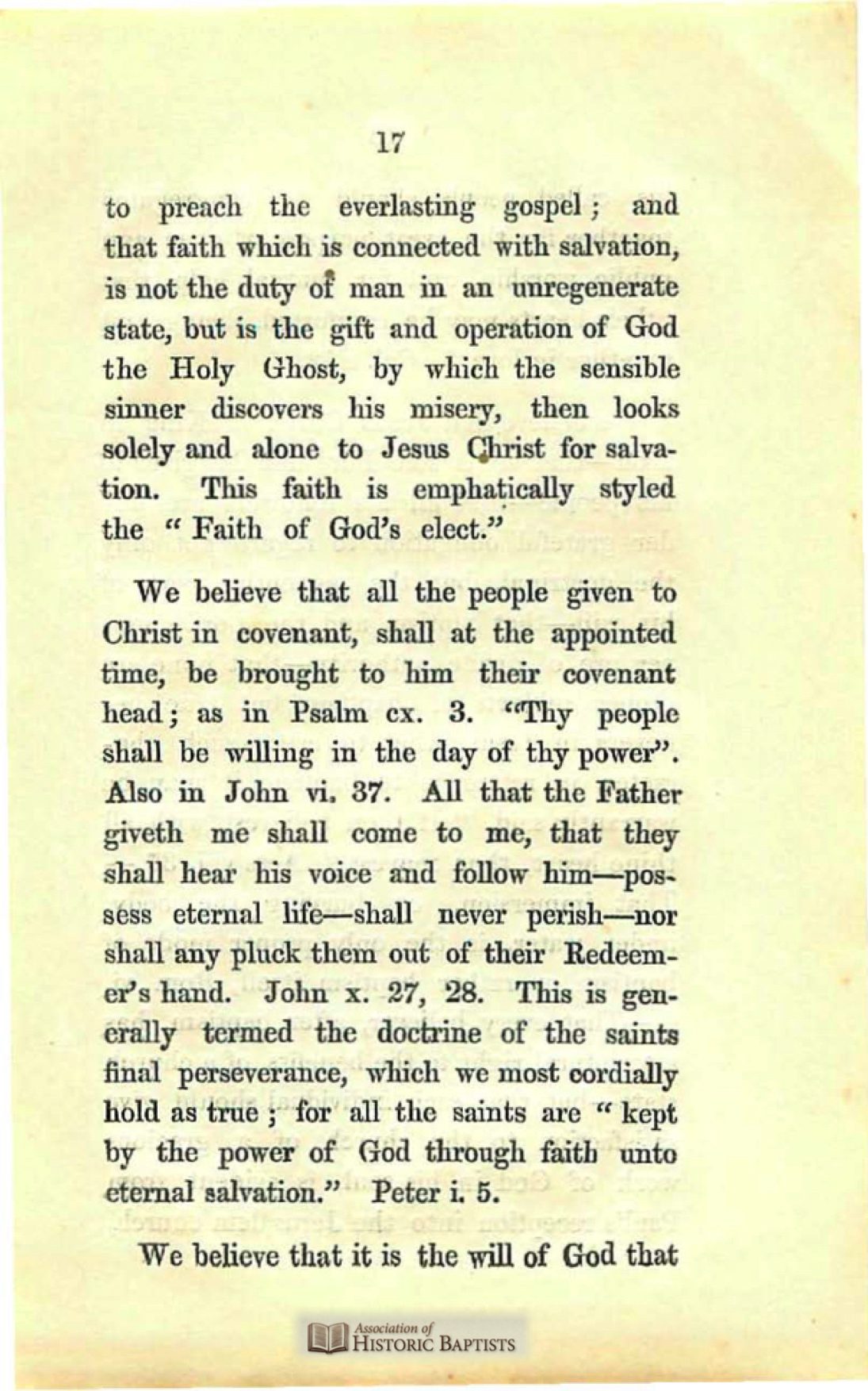 We believe it to be the will and prerogative of the Great Head of the church, to qualify and send forth men as his ministers to preach the everlasting gospel; and that faith which is connected with salvation, is not the duty or man in an unregenerate state, but is the gift and operation of God the Holy Ghost, by which the sensible sinner discovers his misery, then looks solely and alone to Jesus Christ for salvation. This faith is emphatically styled the “Faith of God’s elect.”