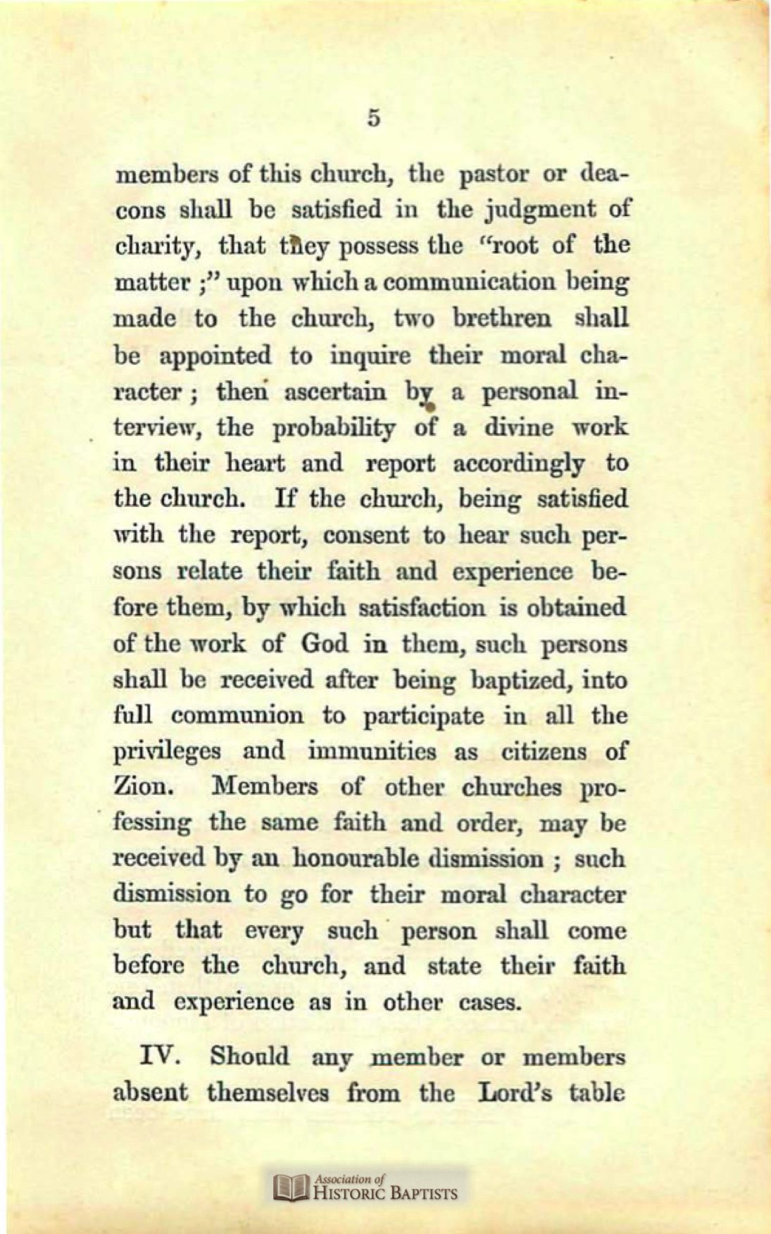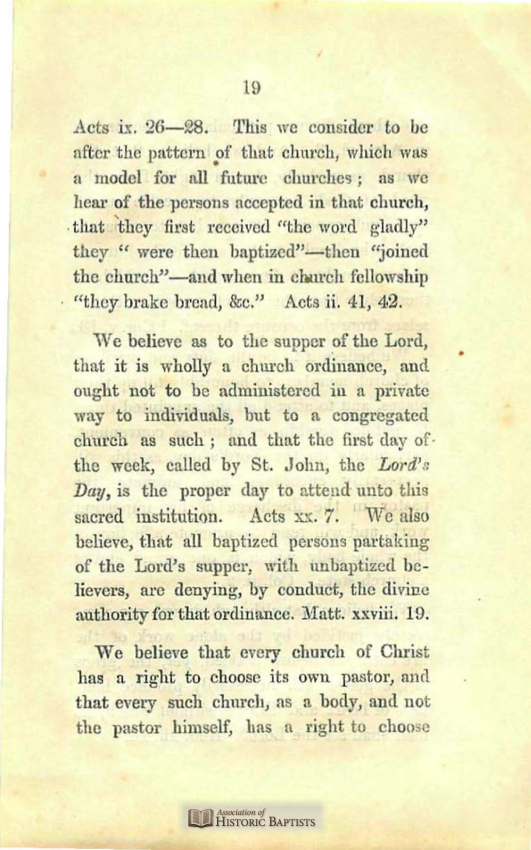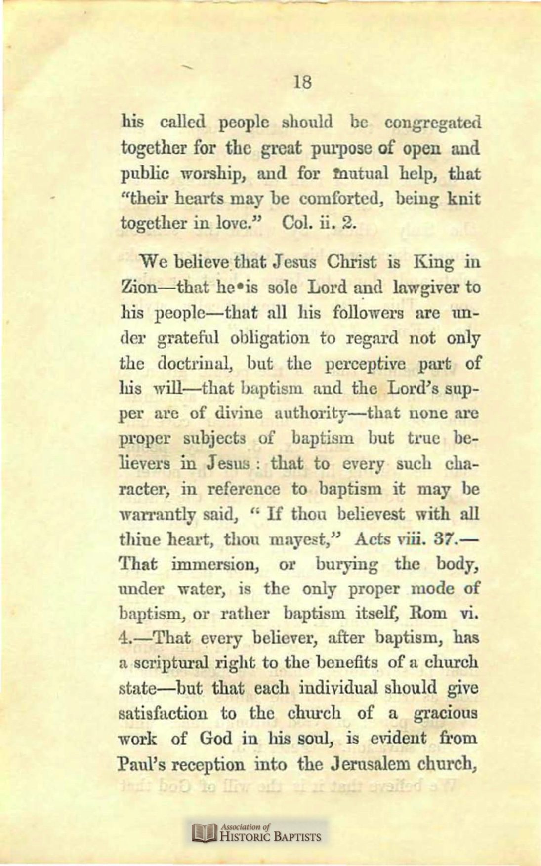 We believe that Jesus Christ is King in Zion—that he is sole Lord and lawgiver to his people—that all his followers are under grateful obligation to regard not only the doctrinal, but the perceptive part of his will—that baptism and the Lord’s supper are of divine authority—that none are proper subjects of baptism but true believers in Jesus: that to every such character, in reference to baptism it may be warrantly said, “If thou believest with all thine heart, thou mayest,” Acts 8:37.— That immersion, or burying the body, under water, is the only proper mode of baptism, or rather baptism itself, Rom 6:4.—That every believer, after baptism, has a scriptural right to the benefits of a church state—but that each individual should give satisfaction to the church of a gracious work of God in his soul, is evident from Paul’s reception into the Jerusalem church, Acts 9:26-28. This we considcr to be after the pattern of that church, which was a model for all future churches; as we hear of the persons accepted in that church, that they first received “the word gladly” they “were then baptized”—then “joined the church”—and when in church fellowship “they brake bread, &c.” Acts 2:41,42.