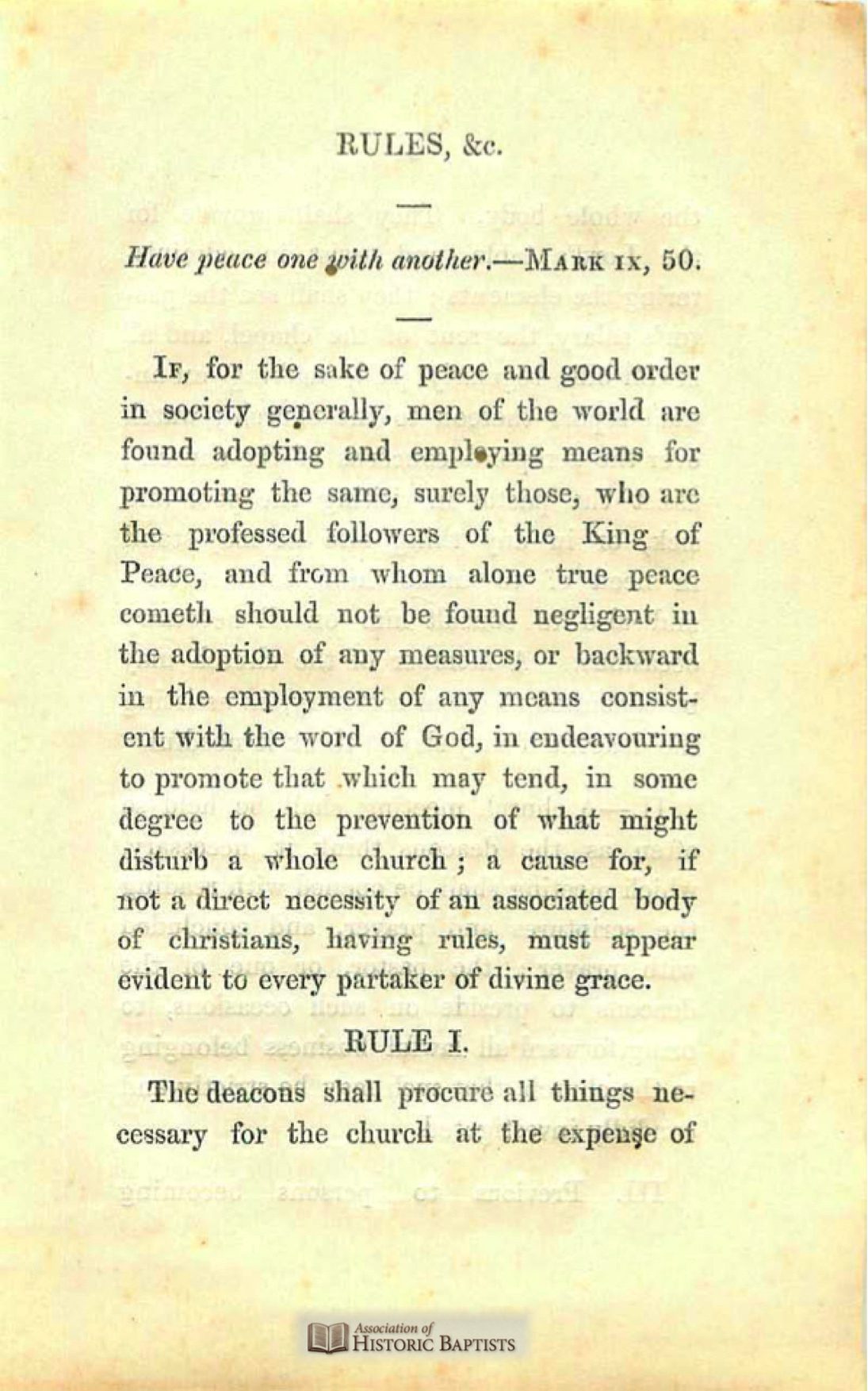 If, for the sake of peace and good order in society generally, men of the world are found adopting and employing means for promoting the same, surely those, who are the professed followers of the King of Peace, and from whom alone true peace cometh should not be found negligent in the adoption of any measures, or backward in the employment of any means consistent with the word of God, in endeavouring to promote that which may tend, in some degree to the prevention of what might disturb a whole church; a cause for, if not a direct necessity of an associated body of christians, having rules, must appear evident to every partaker of divine grace.