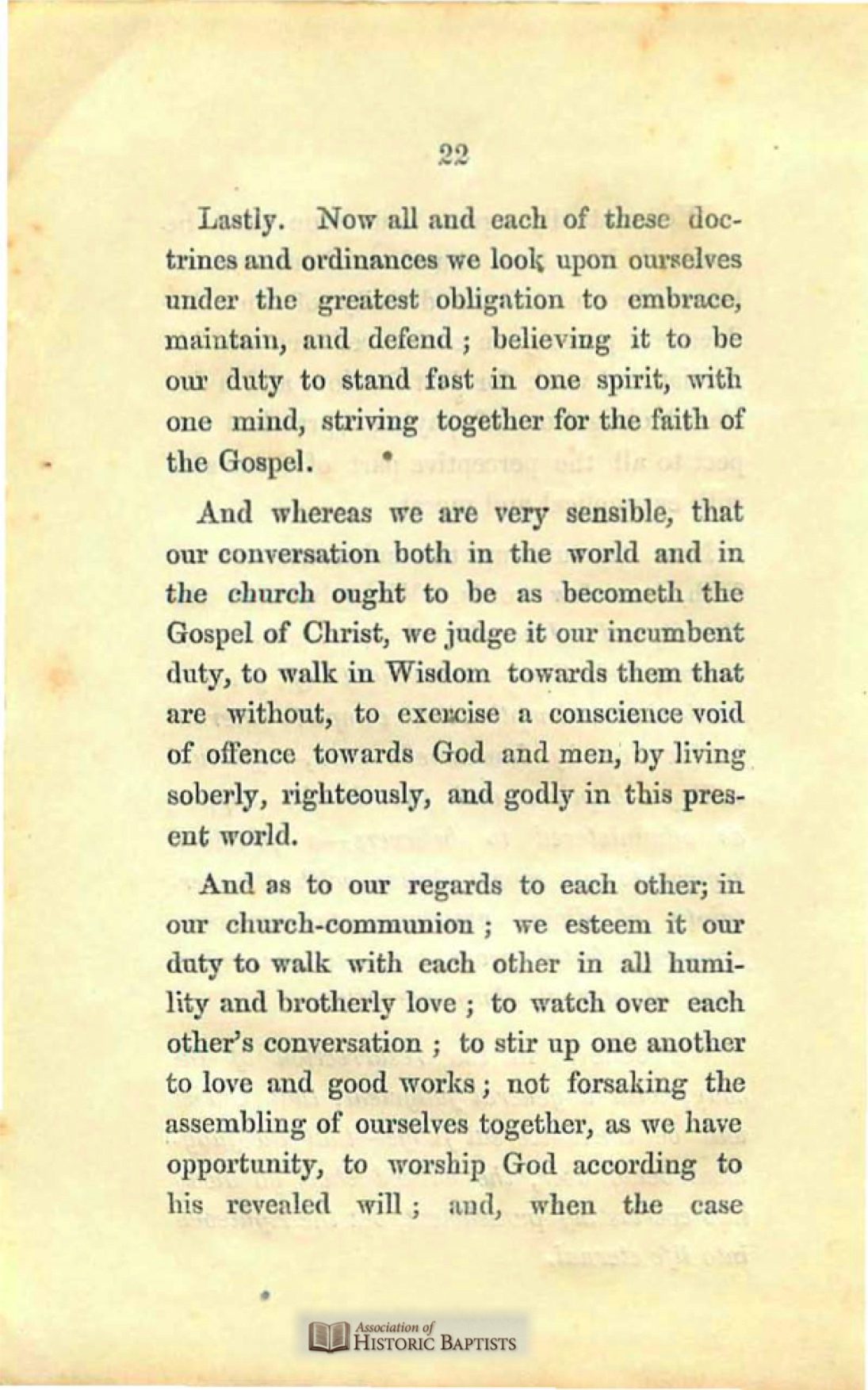 Lastly. Now all and each of these doctrines and ordinances we look upon ourselves under the greatest obligation to embrace, maintain, and defend; believing it to be our duty to stand fast in one spirit, with one mind, striving together for the faith of the Gospel.