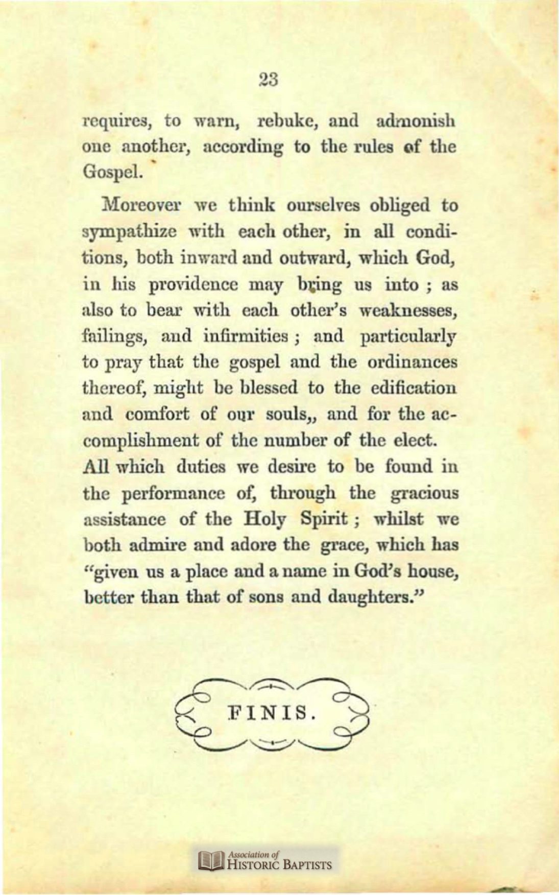 Moreover we think ourselves obliged to sympathize with each other, in all conditions, both inward and outward, which God, in his providence may bring us into; as also to bear with each other’s weaknesses, failings, and infirmities; and particularly to pray that the gospel and the ordinances thereof, might be blessed to the edification and comfort of our souls, and for the accomplishment of the number of the elect. All which duties we desire to be found in the performance of, through the gracious assistance of the Holy Spirit; whilst we both admire and adore the grace, which has “given us a place and a name in God’s house, better than that of sons and daughters.”