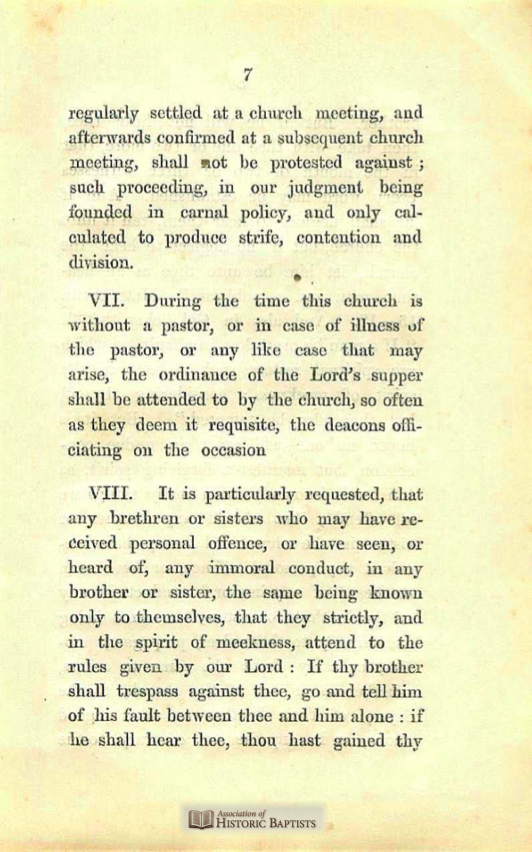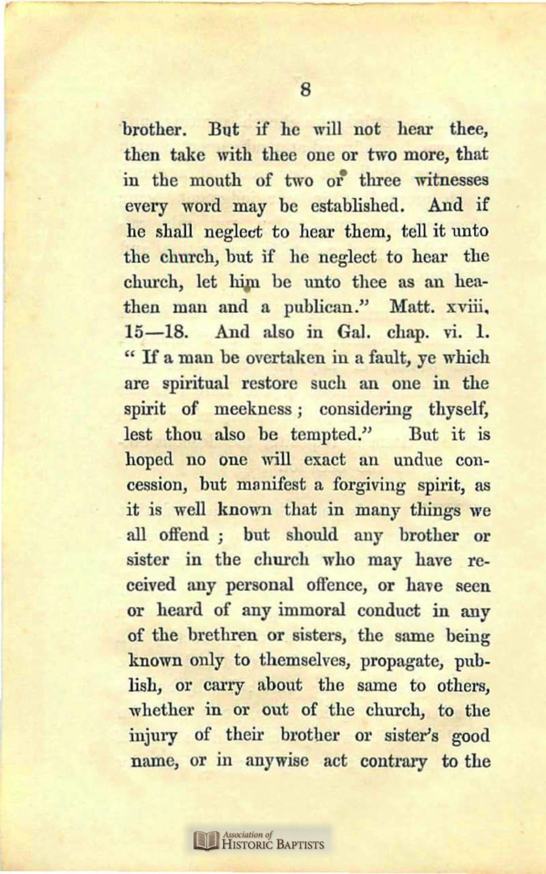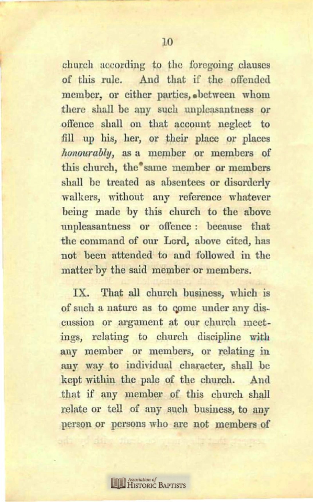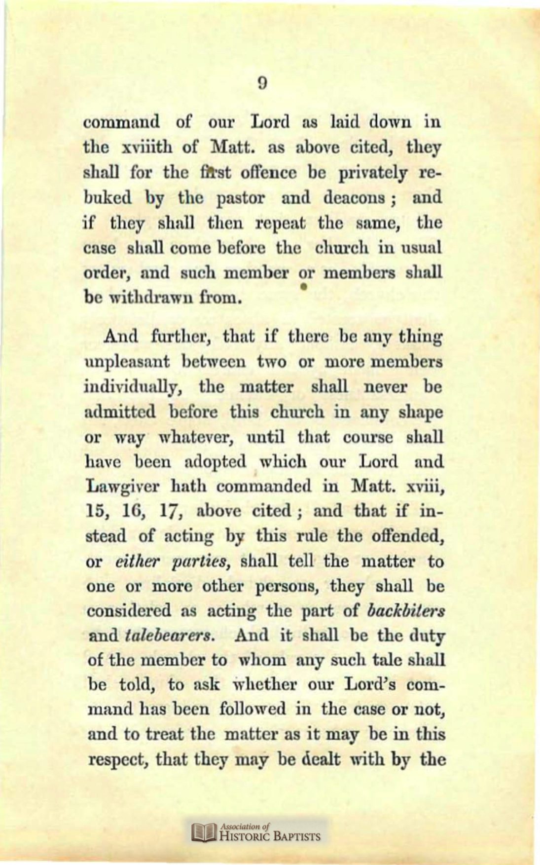 And further, that if there be any thing unpleasant between two or more members individually, the matter shall never be admitted before this church in any shape or way whatever, until that course shall have been adopted which our Lord and Lawgiver hath commanded in Matt. 18:15,16, 17, above cited; and that if instead of acting by this rule the offended, or either parties, shall tell the matter to one or more other persons, they shall be considered as acting the part of backbiters and talebearers. And it shall be the duty of the member to whom any such tale shall be told, to ask whether our Lord’s command has been followed in the case or not, and to treat the matter as it may be in this respect, that they may be dealt with by the church according to the foregoing clauses of this rule. And that if the offended member, or either parties, between whom there shall be any such unpleasantness or offence shall on that account neglect to fill up his, her, or their place or places honourably, as a member or members of this church, the same member or members shall be treated as absentees or disorderly walkers, without any reference whatever being made by this church to the above unpleasantness or offence: because that the command of our Lord, above cited, has not been attended to and followed in the matter by the said member or members.