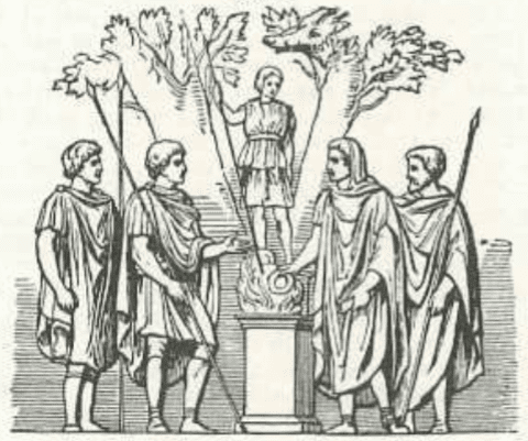 The Christmas tree, now so common among us, was equally common in Pagan Rome and Pagan Egypt. In Egypt that tree was the palm-tree; in Rome it was the fir; the palm-tree denoting the Pagan Messiah, as Baal-Tamar, the fir referring to him as Baal-Berith. The mother of Adonis, the Sun-God and great mediatorial divinity, was mystically said to have been changed into a tree, and when in that state to have brought forth her divine son. If the mother was a tree, the son must have been recognised as the “Man the branch.” And this entirely accounts for the putting of the Yule Log into the fire on Christmas-eve, and the appearance of the Christmas-tree the next morning. As Zero-Asbta, “The seed of the woman,” which name also signified Ignigena, or “born of the fire,” he has to enter the fire on “Mother-night,” that he may be born the next day out of it, as the “Branch of God,” or the Tree that brings all divine gifts to men. But why, it may be asked, does he enter the fire under the symbol of a Log? To understand this, it must be remembered that the divine child born at the winter solstice was born as a new incarnation of the great god (after that god had been cut in pieces), on purpose to revenge his death upon his murderers. Now the great god, cut off in the midst of his power and glory, was symbolised as a huge tree, stripped of all its branches, and cut down almost to the ground. But the great serpent, the symbol of the life restoring AEsculapius, twists itself around the dead stock, and lo, at its side up sprouts a young tree—a tree of an entirely different kind, that is destined never to be cut down by hostile power—even the palm-tree, the well-known symbol of victory.
