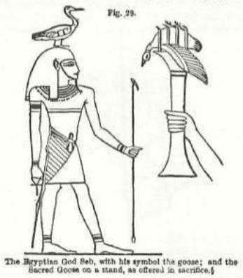 Wilkinson, in reference to Egypt, shows that “the favourite offering” of Osiris was “a goose,” and moreover, that the “goose could not be eaten except in the depth of winter.” As to Rome, Juvenal says, “that Osiris, if offended, could be pacified only by a large goose and a thin cake.” In many countries we have evidence of a sacred character attached to the goose. It is well known that the capitol of Rome was on one occasion saved when on the point of being surprised by the Gauls in the dead of night, by the cackling of the geese sacred to Juno, kept in the temple of Jupiter. The accompanying wood-cut proves that the goose in Asia Minor was the symbol of Cupid, just as it was the symbol of Seb in Egypt.