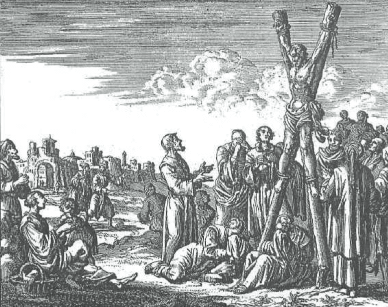 The Christians and other pious people besought the governor to give Andrew unto them, and take him down from the cross. (For it appears that he was not nailed to the cross, like Christ, but tied to it). When the apostle learned of this, he cried to God, saying, “O Lord Jesus Christ! suffer not that Thy servant, who hangs here on the tree for Thy name’s sake, be released, to dwell again among men; but receive me. O my Lord, my God! Whom I have known, whom I loved, to whom I cling, whom I desire to see, and in whom I am what I am.” Having spoken these words, the holy apostle committed his spirit into the hands of his heavenly Father. M. W. Baudart in Apophthegm Christian, lib. 1, super Andream, ex August, de Vera et Falsa Poenitentia., cap 8, Bernhard. in Sermon, de Andrea. Lanfrancus contra Berengar. Niccph., lib. 2, cap. 39, and lib. 15, cap. 39. Remigius in Psal. 21 and 40. Johan. Strat. in Festo Andreae, p. 23, haec et alia. Also, Konst-tooneel van veertig, by N. D. C, Concerning the Life of Andrew.