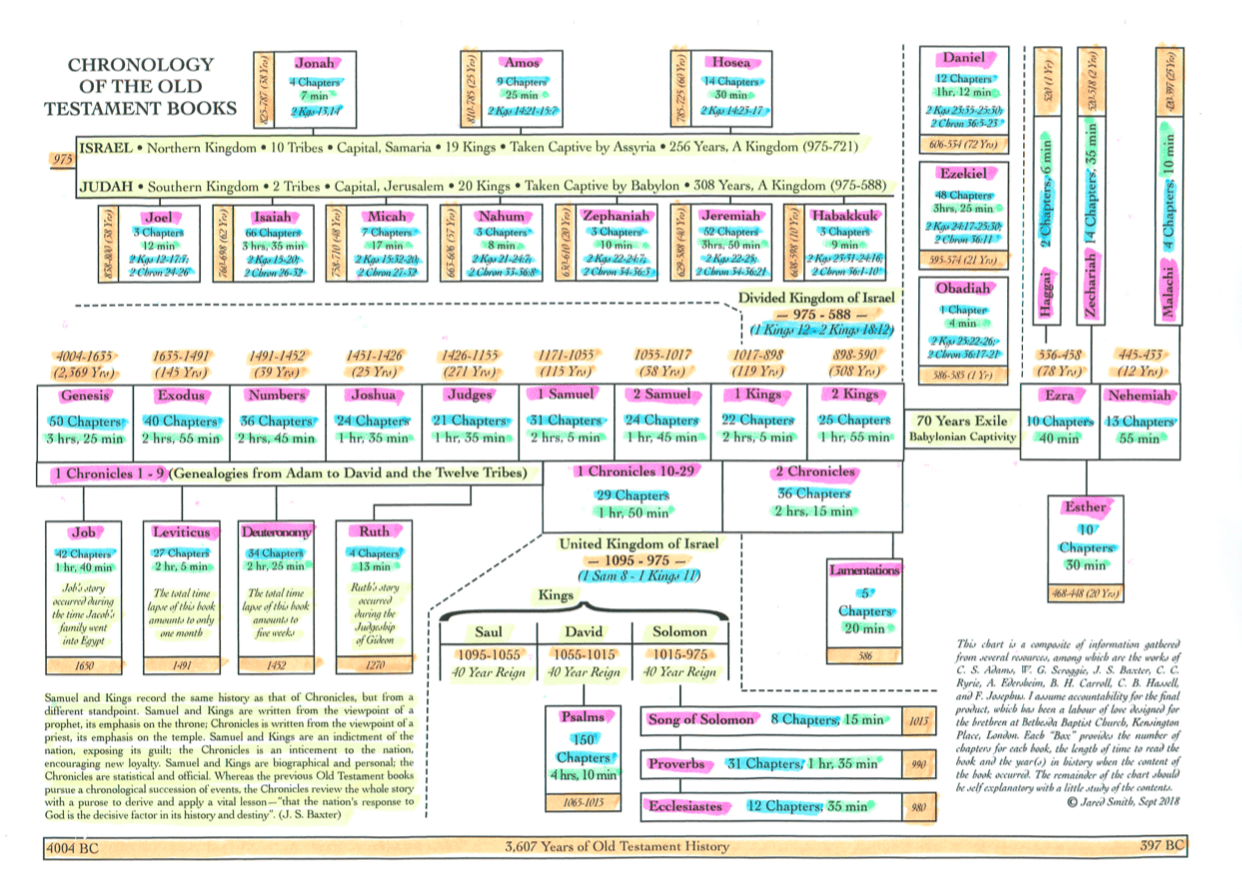 Now, the books of the Bible may certainly be read according to this logical arrangement. And that is how many Christians read through the scriptures. However, I would like to suggest another way to read through the books of the Bible. It may be done chronologically. To that end, I drew up a chronological chart several years ago for the church I pastored in London. The chart indicates where each book fits within a historical context. I have done this for the 39 books of the Old Testament and the 27 books of the New Testament. Now, the dates for each book are not an exact science. We do not know for absolute certainty when every book of the Bible was written or where it should fit on the timeline. There should be, therefore, a measure of flexibility on the matter. I hope you will not be put off by this chronological chart if you do not entirely agree with the order in which I have placed certain books. I am not dogmatic on the matter. If you believe a book should be placed in a different order, then make that change in your notes, and use your own chronological order of Bible books. The important thing, and that which I am driving at in this study, is that a chronological chart will serve as an important navigational tool as you journey through the Bible. First, it will unify the biblical narrative of historic events; second, it will more clearly demonstrate God’s unfolding revelation of the Covenant of Grace; third, it will nurture a sense of anticipation and suspense while moving from one book to the next.