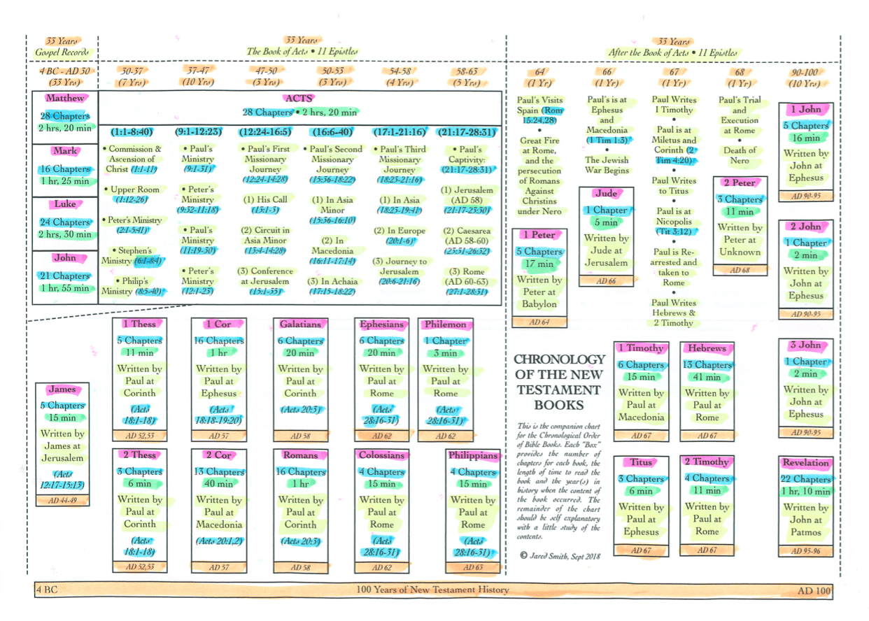 As you know from our first study in this series on Bible Reading, the books of the Bible are not listed in chronological order. Rather, they are arranged in a logical order—the first seventeen books of the Old Testament are grouped together as historical books; the last seventeen are prophetical books; and the middle five are experiential books. And then, for the New Testament, the first four are grouped together as historical books detailing the life of Christ and the origin of the church; the fifth book stands alone as a historical record detailing expansion of the church; the remaining 22 books are all letters, the first nine written by Paul to churches, the last nine written by various men to churches, and the middle four written by Paul dealing with pastoral issues.