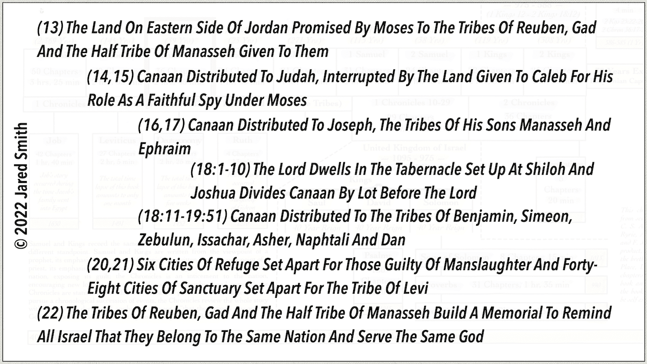 In chapters 20 and 21, six cities of refuge are set apart for those guilty of manslaughter, together with another forty-eight cities of sanctuary set apart for the tribe of Levi. Of course, this meant that throughout the land of Canaan, the social and religious laws of the nation of Israel permeated the land, which in turn encouraged the people to maintain civility and nurture a healthy respect for the Lord God.