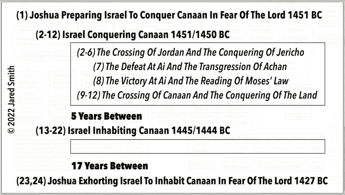 In chapter 1, we have Joshua preparing Israel to conquer Canaan in the fear of the Lord. This occurred in the year 1451 BC.