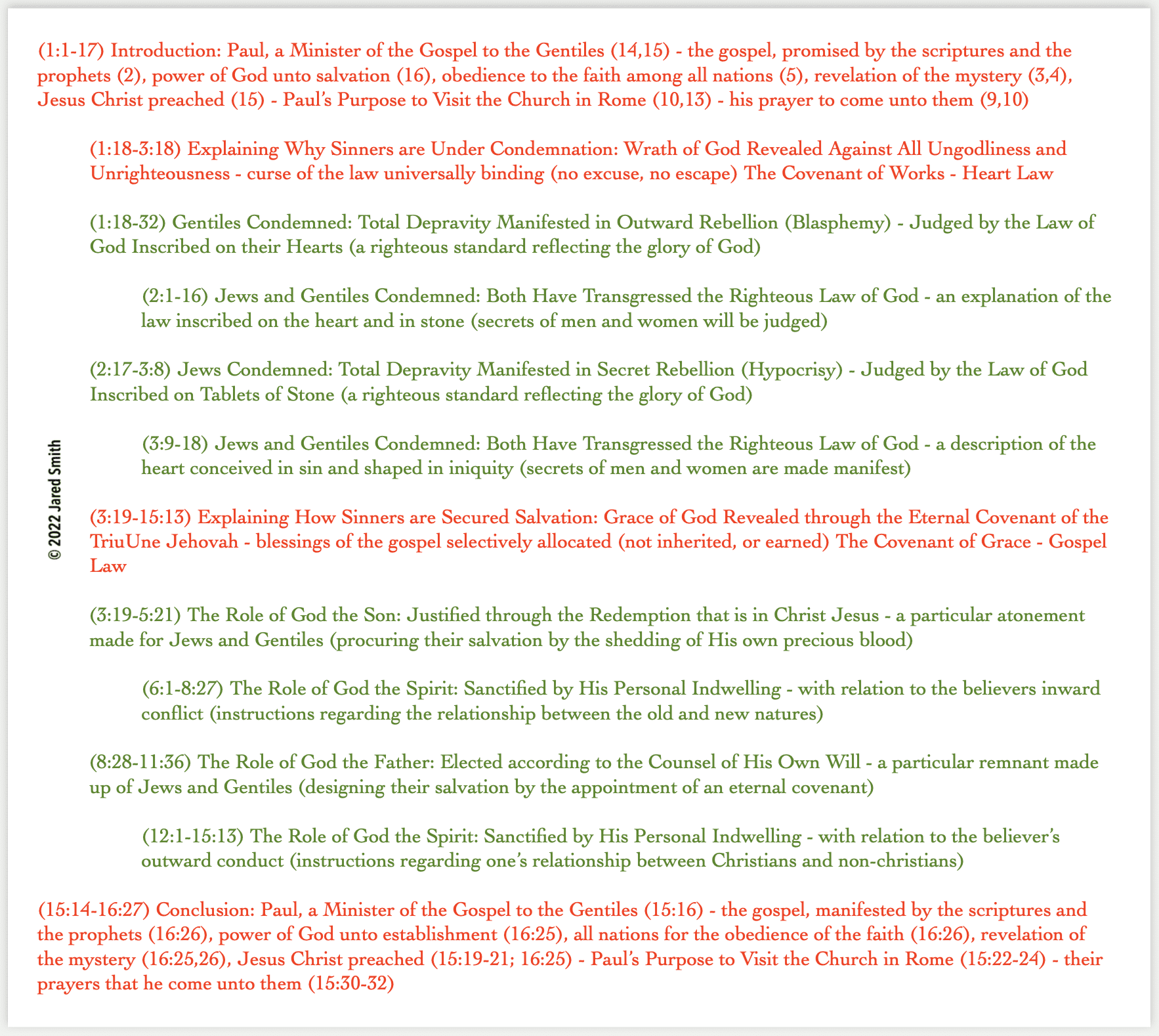 And so, we have in Paul’s letter to the Romans as a whole, a comprehensive explanation of sin and salvation. Please notice, it revolves around the two perpetual covenants under which the members of the human race are accountable unto God—that of works and grace. Now, if we align the teachings of this letter with the framework of sovereign grace, do you see how it all meshes together? In (1:18-3:18), Paul explains how the human race is in relationship to God under the authority of the covenant of works, whereas in (3:19-15:13), he explains how the elect are secured salvation under the authority of the covenant of grace.