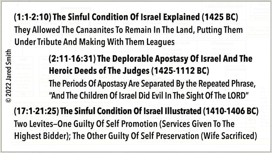 In (1:1-2:10), an explanation is given for Israel’s sinful condition. In essence, rather than driving out the Canaanites from the land, they allowed them to remain in the land, opting to put them under tribute and making with them various treaties and covenants. This explanation is set around 1425 BC.