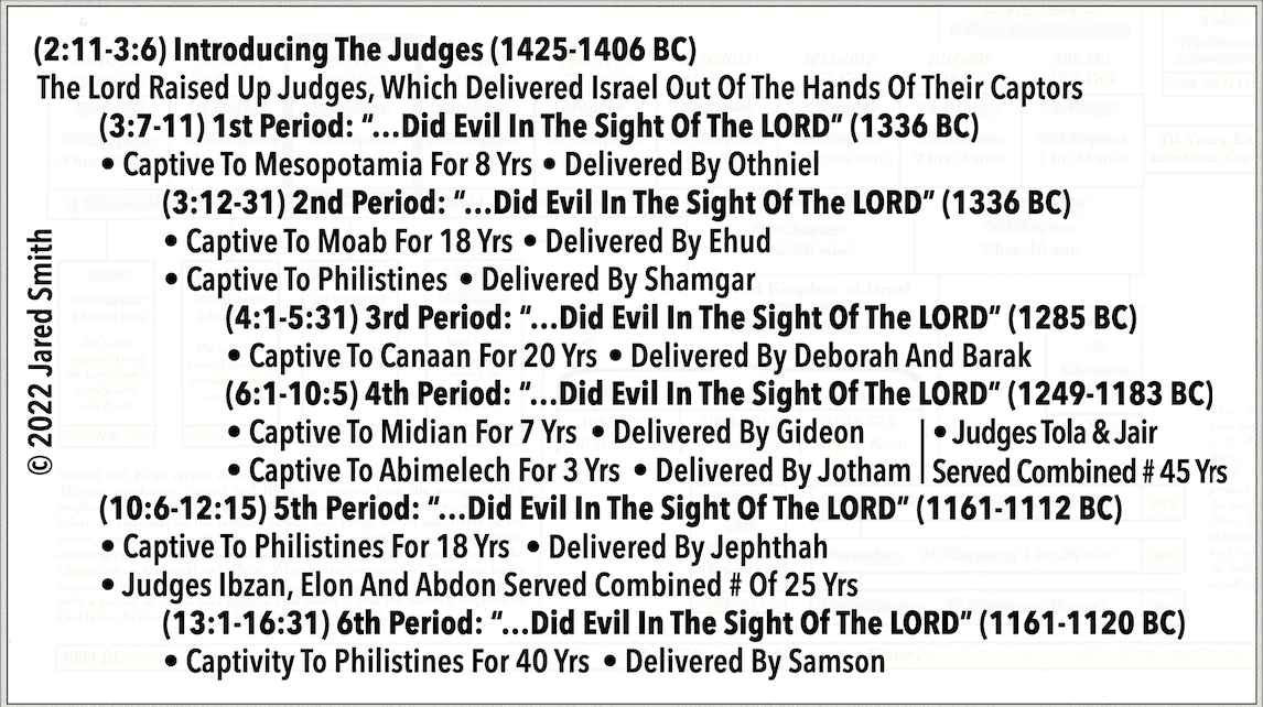 In (2:11-3:6), the reason for God raising up the Judges to lead the nation of Israel is introduced. The events of this section occurred between 1425-1406 BC.