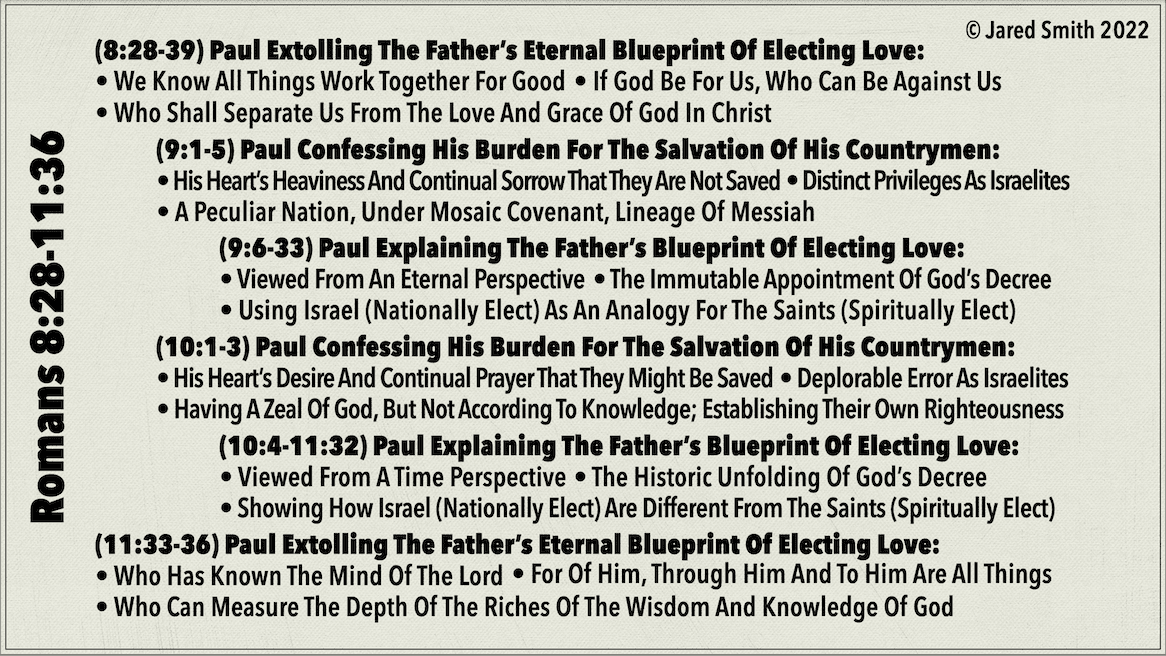 As I close this study, allow me to draw your attention back to the main structure of Paul’s teachings on how a sinner is secured salvation (3:19-15:13). You know, so much attention is given to the role of the Son in the work of salvation; and a great deal of attention is given to the Spirit in work of salvation; but sadly, the role of the Father is either neglected or sidelined. And, even when some people do give attention to the role of the Father, they usually lean upon Ephesians chapter 1 as the basis for the Father’s work. Well, while Ephesians 1 does speak of the Father’s work, it doesn’t explain the extent of His work as is recorded here in Romans 8:28-11:36. Now please listen to me, if we nurture cloudy views of the Father’s role in salvation, then we will inevitably have cloudy views of the Son and Spirit’s roles in salvation. It all begins with the Father, and so we would be wise to carefully read Paul’s teachings on the matter, strengthening our views of sovereign grace accordingly. Why not set aside a few hours this week, take the notes I have given in this study, and read through this section of Paul’s letter, comparing the teachings of scripture with the Framework of sovereign grace? If you do this, not only will it nurture a growth in grace, but it will also prepare you for our next study, when I hope to consider how Paul’s analogy of a potter and the clay fits within the more immediate context of Romans chapter 9 as a whole. Until then, may you know the blessings of Jehovah in the love and grace of the Lord Jesus Christ!