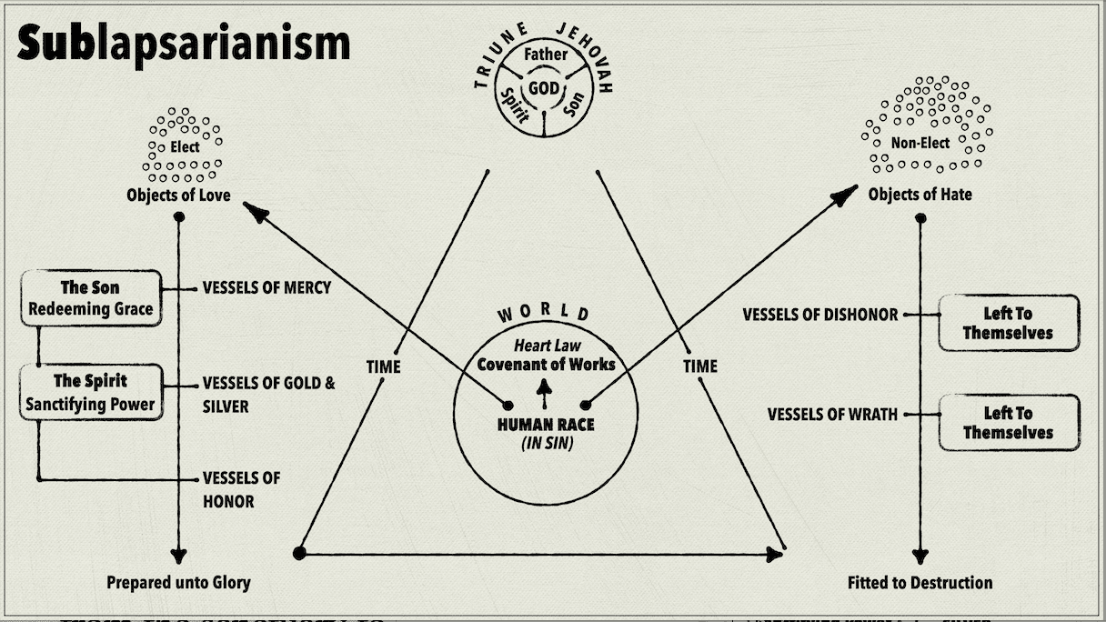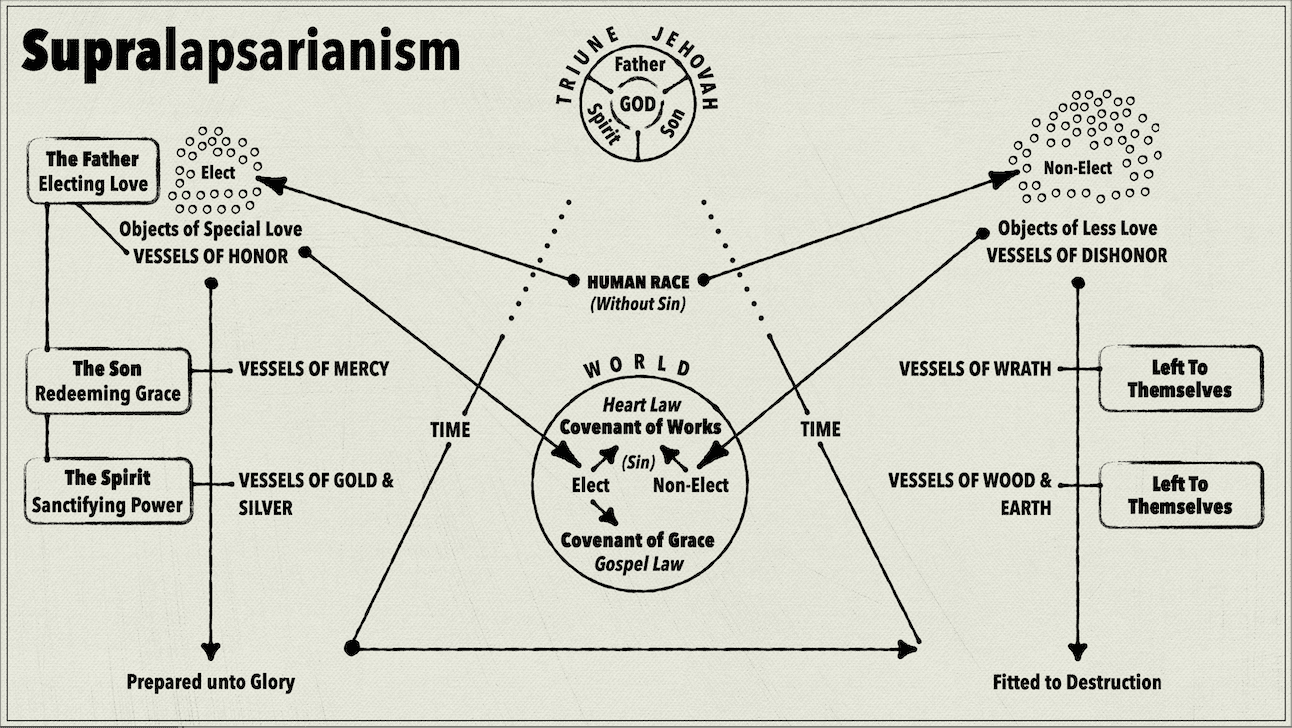 We begin with the TriUne Jehovah. First, God the Father envisions the whole mass of the human race, without considering them in sin, choosing to set some apart as objects of His special love, making them vessels unto honor, while setting aside the others as objects of less love, making them vessels unto dishonor. Second, He determines how He will bring the human race into existence—they will be brought under the restraints of a time continuum and placed in a purpose built world. Third, He establishes with Adam a covenant of works, appointing him to serve as the covenant head for the entire human race; Fourth, He arranges the Fall of Adam, in consequence of which the entire human race is plunged into sin and condemnation; Fifth, He leaves the objects of less love to themselves, in their sins, making them vessels of wrath and vessels of wood and earth, fitting them to destruction; Sixth, Because the Father has already set His love upon His elect people, He devises a twofold plan of salvation to deliver the objects of His special love from their sins: (1) The elect are given to the Son (hence, they are chosen in Christ), Who is appointed by the Father to serve as their Mediator and Redeemer; (2) The elect are given to the Holy Spirit, Who is appointed by the Father and the Son to serve as their Sanctifier (beginning with the work of regeneration). It is in this way, the elect are prepared unto glory, according to the three branches of the gospel, which is none other than the gracious covenant of the TriUne Jehovah, designed for and promised only to God’s elect. In a nutshell, this is the Supralapsarian framework of God’s decree of election.