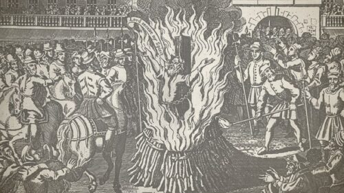 John Rogers was educated at Cambridge, and was afterward many years chaplain to the merchant adventurers at Antwerp in Brabant. Here he met with the celebrated martyr William Tyndale, and Miles Coverdale, both voluntary exiles from their country for their aversion to popish superstition and idolatry. They were the instruments of his conversion; and he united with them in that translation of the Bible into English, entitled “The Translation of Thomas Matthew.” From the Scriptures he knew that unlawful vows may be lawfully broken; hence he married, and removed to Wittenberg in Saxony, for the improvement of learning; and he there learned the Dutch language, and received the charge of a congregation, which he faithfully executed for many years. On King Edward’s accession, he left Saxony to promote the work of reformation in England; and, after some time, Nicholas Ridley, then bishop of London, gave him a prebend in St. Paul’s Cathedral, and the dean and chapter appointed him reader of the divinity lesson there. Here he continued until Queen Mary’s succession to the throne, when the Gospel and true religion were banished, and the Antichrist of Rome, with his superstition and idolatry, introduced. The circumstance of Mr. Rogers having preached at Paul’s cross, after Queen Mary arrived at the Tower, has been already stated. He confirmed in his sermon the true doctrine taught in King Edward’s time, and exhorted the people to beware of the pestilence of popery, idolatry, and superstition. For this he was called to account, but so ably defended himself that, for that time, he was dismissed. The proclamation of the queen, however, to prohibit true preaching, gave his enemies a new handle against him. Hence he was again summoned before the council, and commanded to keep his house. He did so, though he might have escaped; and though he perceived the state of the true religion to be desperate. He knew he could not want a living in Germany; and he could not forget a wife and ten children, and to seek means to succor them. But all these things were insufficient to induce him to depart, and, when once called to answer in Christ’s cause, he stoutly defended it, and hazarded his life for that purpose. After long imprisonment in his own house, the restless Bonner, bishop of London, caused him to be committed to Newgate, there to be lodged among thieves and murderers. After Mr. Rogers had been long and straitly imprisoned, and lodged in Newgate among thieves, often examined, and very uncharitably entreated, and at length unjustly and most cruelly condemned by Stephen Gardiner, bishop of Winchester, the fourth day of February, in the year of our Lord 1555, being Monday in the morning, he was suddenly warned by the keeper of Newgate’s wife, to prepare himself for the fire; who, being then sound asleep, could scarce be awaked. At length being raised and awaked, and bid to make haste, then said he, “If it be so, I need not tie my points.” And so was had down, first to bishop Bonner to be degraded: which being done, he craved of Bonner but one petition; and Bonner asked what that should be. Mr. Rogers replied that he might speak a few words with his wife before his burning, but that could not be obtained of him. When the time came that he should be brought out of Newgate to Smithfield, the place of his execution, Mr. Woodroofe, one of the sheriffs, first came to Mr. Rogers, and asked him if he would revoke his abominable doctrine, and the evil opinion of the Sacrament of the altar. Mr. Rogers answered, “That which I have preached I will seal with my blood.” Then Mr. Woodroofe said, “Thou art an heretic.” “That shall be known,” quoth Mr. Rogers, “at the Day of Judgment.” “Well,” said Mr. Woodroofe, “I will never pray for thee.” “But I will pray for you,” said Mr. Rogers; and so was brought the same day, the fourth of February, by the sheriffs, towards Smithfield, saying the Psalm Miserere by the way, all the people wonderfully rejoicing at his constancy; with great praises and thanks to God for the same. And there in the presence of Mr. Rochester, comptroller of the queen’s household, Sir Richard Southwell, both the sheriffs, and a great number of people, he was burnt to ashes, washing his hands in the flame as he was burning. A little before his burning, his pardon was brought, if he would have recanted; but he utterly refused it. He was the first martyr of all the blessed company that suffered in Queen Mary’s time that gave the first adventure upon the fire. His wife and children, being eleven in number, ten able to go, and one sucking at her breast, met him by the way, as he went towards Smithfield. This sorrowful sight of his own flesh and blood could nothing move him, but that he constantly and cheerfully took his death with wonderful patience, in the defense and quarrel of the Gospel of Christ.”