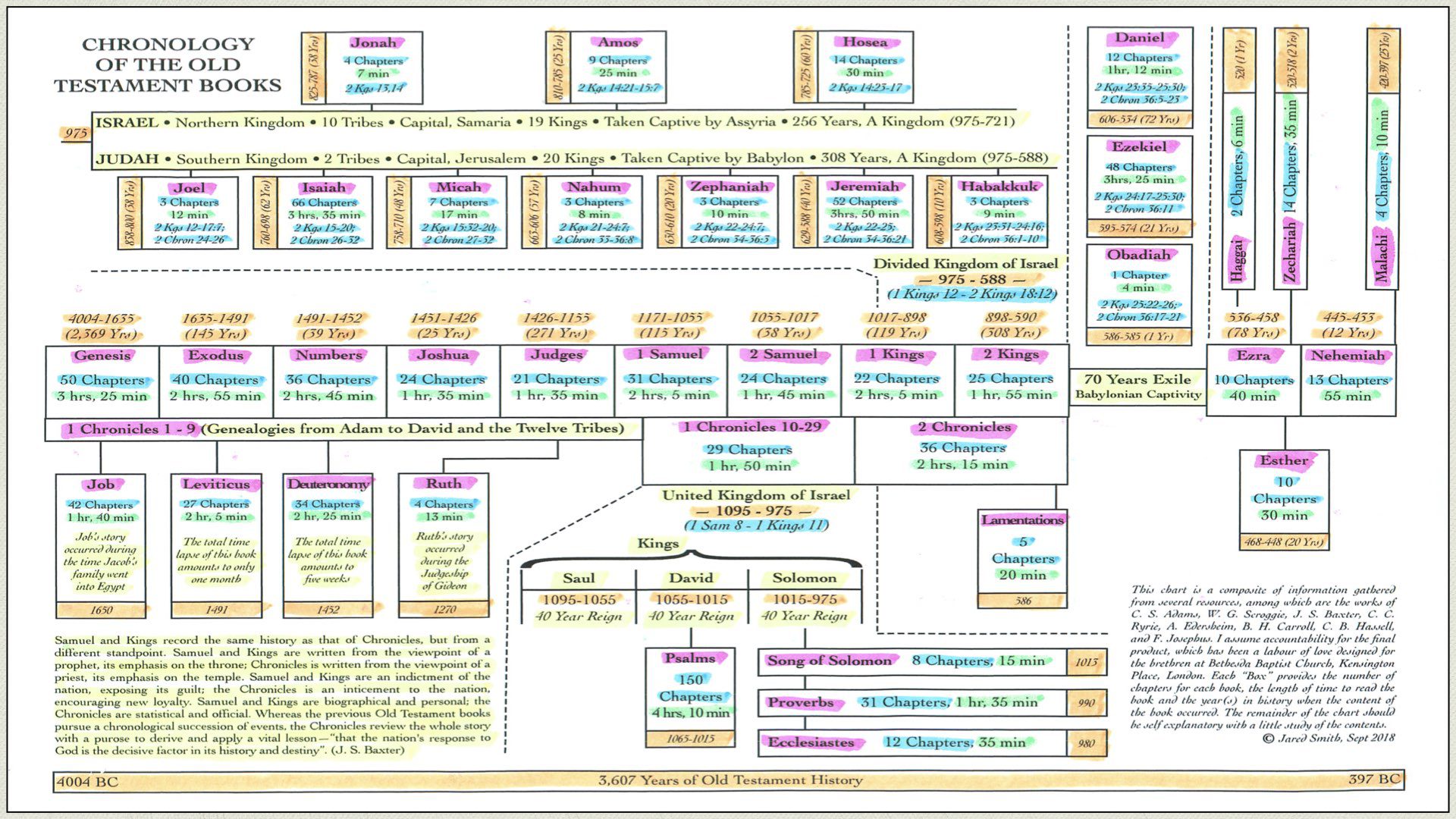 I have indicated for each book the time period in which the narrative occurs, the number of years covered by the book, the number of chapters in the book and the length of time required to read it. If another book of the Bible occurs within that same time period, this too is indicated on the chart. Thus far, I have given an overview for the first twelve books—Genesis, Job, Exodus, Leviticus, Numbers, Deuteronomy, Joshua, Judges, Ruth, 1 Samuel, 2 Samuel and Psalms. We are now ready to resume our studies with the book of 1 Kings, which I hope to do next week.