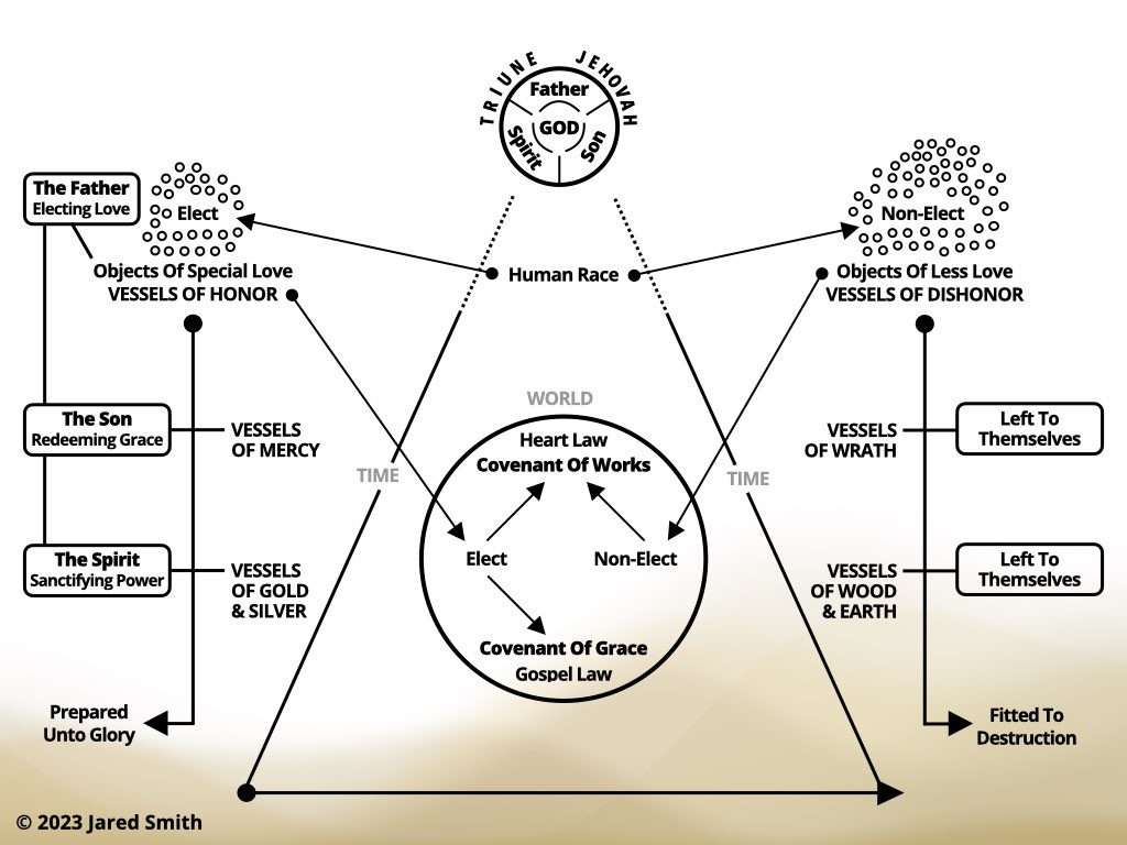 This overview of God’s masterplan is actually set forth by Paul himself in Romans 9. Therein he represents God as the Potter, envisioning the whole mass of the human race without sin, represented as a pure lump of clay, out from which the Father sets apart some people as objects of special love, making them vessels unto honor, while setting aside the others as objects of less love, making them vessels unto dishonor. This teaching has come to be known as the doctrine of Unconditional Election. The Father then determined to bring the human race into existence under the headship of Adam, with whom He would make a covenant of works, requiring of him perfect obedience to the heart law. In consequence of Adam’s transgression, the entire human race would be plunged into sin and misery. This teaching has come to be known as the doctrine of Total Depravity. The Father then determined to leave the non-elect in their sins, making them vessels of wrath and vessels of wood and earth, fitting them to destruction. This teaching has come to be known as the doctrine of Reprobation. However, as He already obligated Himself to the elect, setting His special love upon them, so He devised for them a plan of salvation. The first part of His plan was to give the elect to His Son, appointing Him to serve as their Mediator and Redeemer, making them vessels of mercy. In this way the Father would freely justify sinners through the redemption that is in Christ Jesus. This teaching has come to be known as the doctrine of Limited Atonement, or, Particular Redemption. The second part of His plan was to give the elect to the Spirit, appointing Him to serve as their Regenerator and Sanctifier, making them vessels of gold and silver. In this way the Father would freely regenerate sinners by uniting their souls to Christ, through the effectual power of the Holy Spirit. This teaching has come to be known as the doctrine of Irresistible Grace. This twofold plan of salvation is what we call the covenant of grace, or the covenant of redemption, wherein the TriUne Jehovah prepares His people unto glory. And this teaching has come to be known as the doctrine of the Perseverance and the Preservation of the Saints. All-in-all, this diagram sets forth what is commonly called the Doctrines of Grace, which is why I have labeled it the Framework of Sovereign Grace.