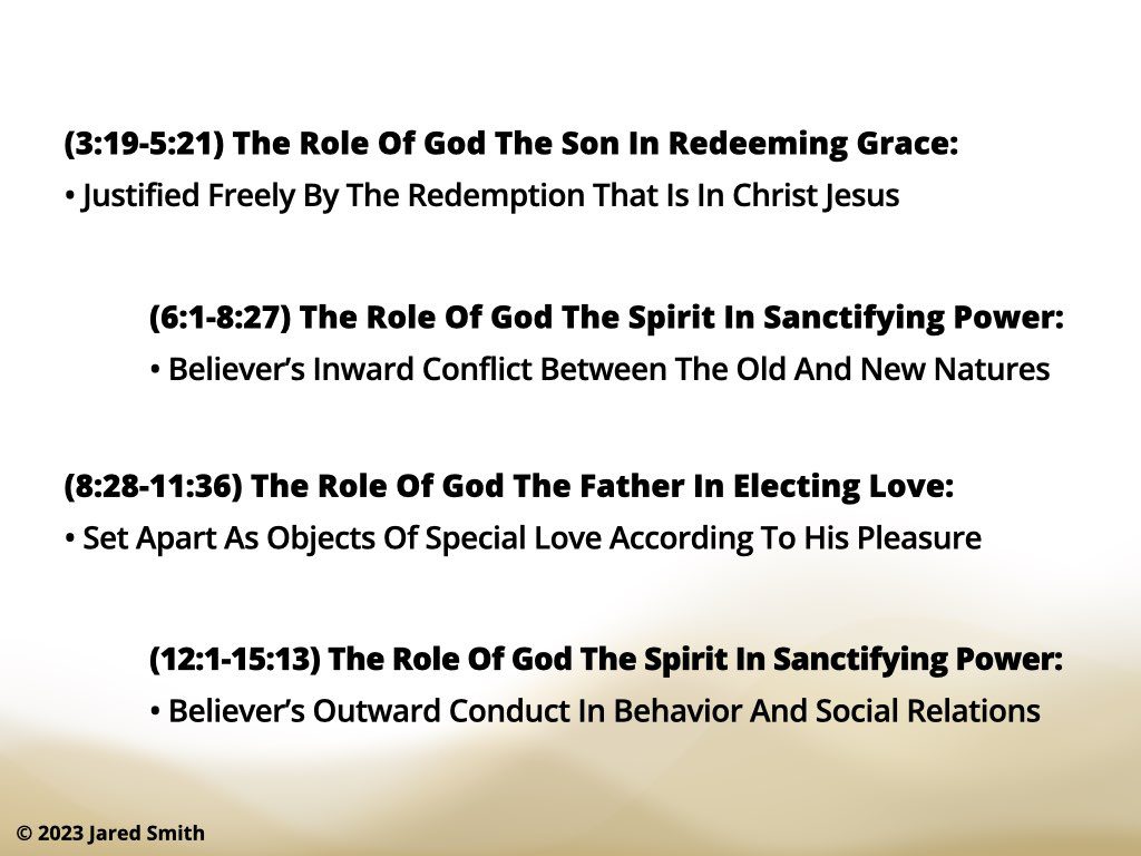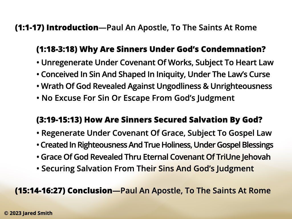 Now, the entire book of Romans is designed to explain in detail what I have just summarized for you according to this diagram. When Paul answers the question about sinners under God’s condemnation in (1:18-3:18), he is referring to the covenant of works God made with Adam on behalf of the human race. And when he answers the question about sinners under God’s grace in (3:19-15:13), he is referring to the covenant of grace the TriUne Jehovah made with Himself on behalf of the elect. It is for this reason I am using both the structure and the framework as the backdrop for my commentary styled exposition of Paul’s letter to the Romans. Everything I say about the book fits within the context of this structure and framework. So, that is what I covered in the first study of this series.