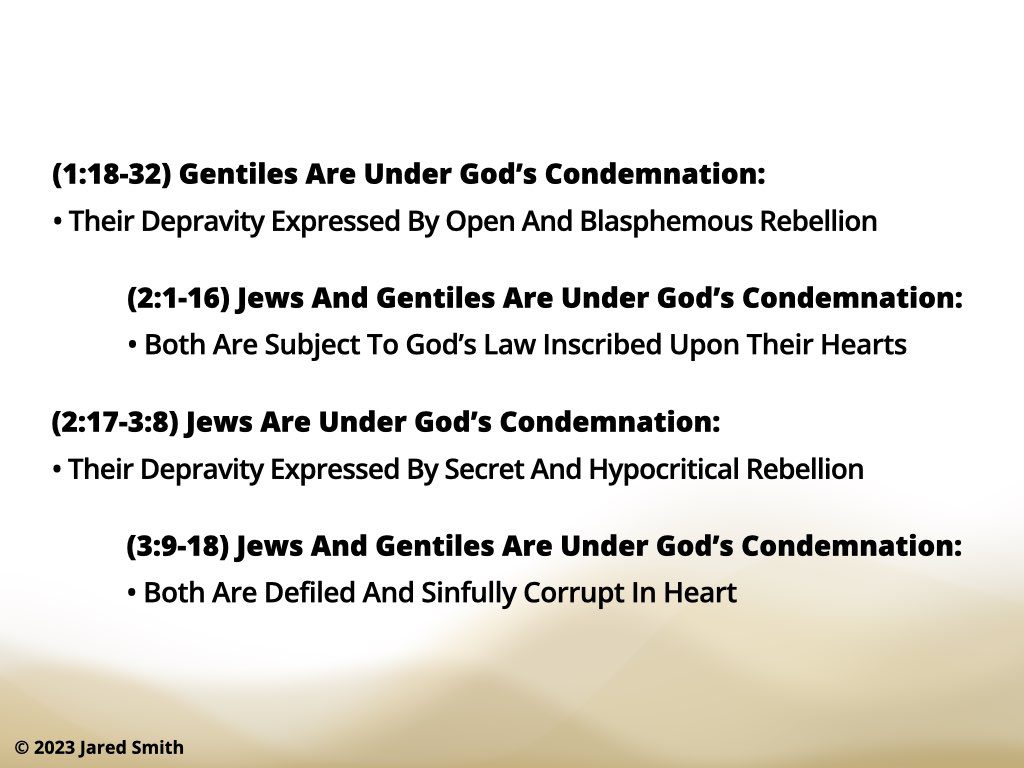 In (1:18-32), Paul singles out the Gentiles, explaining why they are under divine condemnation, exposing their open and blasphemous rebellion against God; In (2:1-16), he joins together the Jews and Gentiles, explaining how they are all subject to the Law God has inscribed upon their hearts; In (2:17-3:8), he singles out the Jews, explaining why they are under divine condemnation, exposing their secret and hypocritical rebellion against God; In (3:9-18), he joins together the Jews and Gentiles again, describing the sinful corruption of all their hearts. Thus, we have in these chapters an interplay between the Jews and the Gentiles, Paul distinguishing them on the one hand, but uniting them on the other.