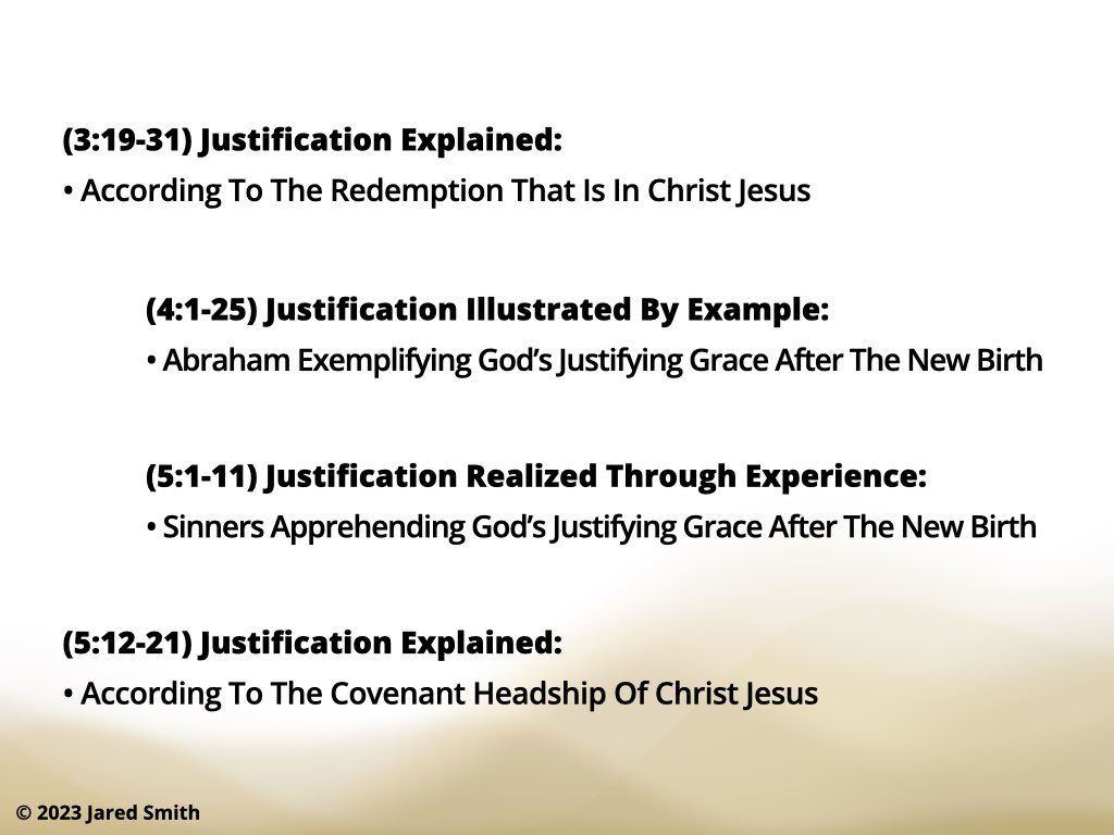 In (3:19-31), Paul explains the meaning of justification, as it relates to the redeeming work of the Lord Jesus Christ. In (4:1-25), he gives an example of Abraham who had been freely justified by Christ’s redemption. In (5:1-11), he describes the experience of sinners who are brought to a realization of their justification. In (5:12-21), he returns to an explanation of justification, as it relates to the covenant headship of the Lord Jesus Christ. As you can see, the sinner’s justification is handled by Paul with great care, and it was the first part of his teachings I looked at in the previous study—his explanation on what the term justification means, with particular reference to the redeeming grace of the Lord Jesus Christ.