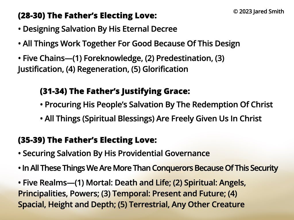 • A group of sovereign grace Baptists promulgate a strange doctrine that God predestinates only the work of salvation for sinners, but nothing else which comes to pass in time—they believe the “all things” of verse 28 refer only to the five things highlighted in verses 29,30 (foreknowledge, predestination, regeneration, justification and glorification). However, it is quite clear the “all things” of verse 28 refer to “all these things” in verses 35-39, therefore including everything which comes to pass in time.