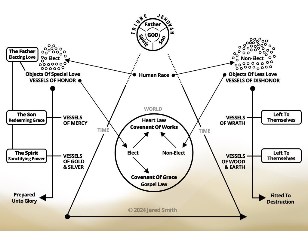 The design of what God is doing can’t clearly be seen down here (pointing to the Framework of Sovereign Grace). It looks like a mess down here. His design is treasured above. It’s treasured here in His decree.