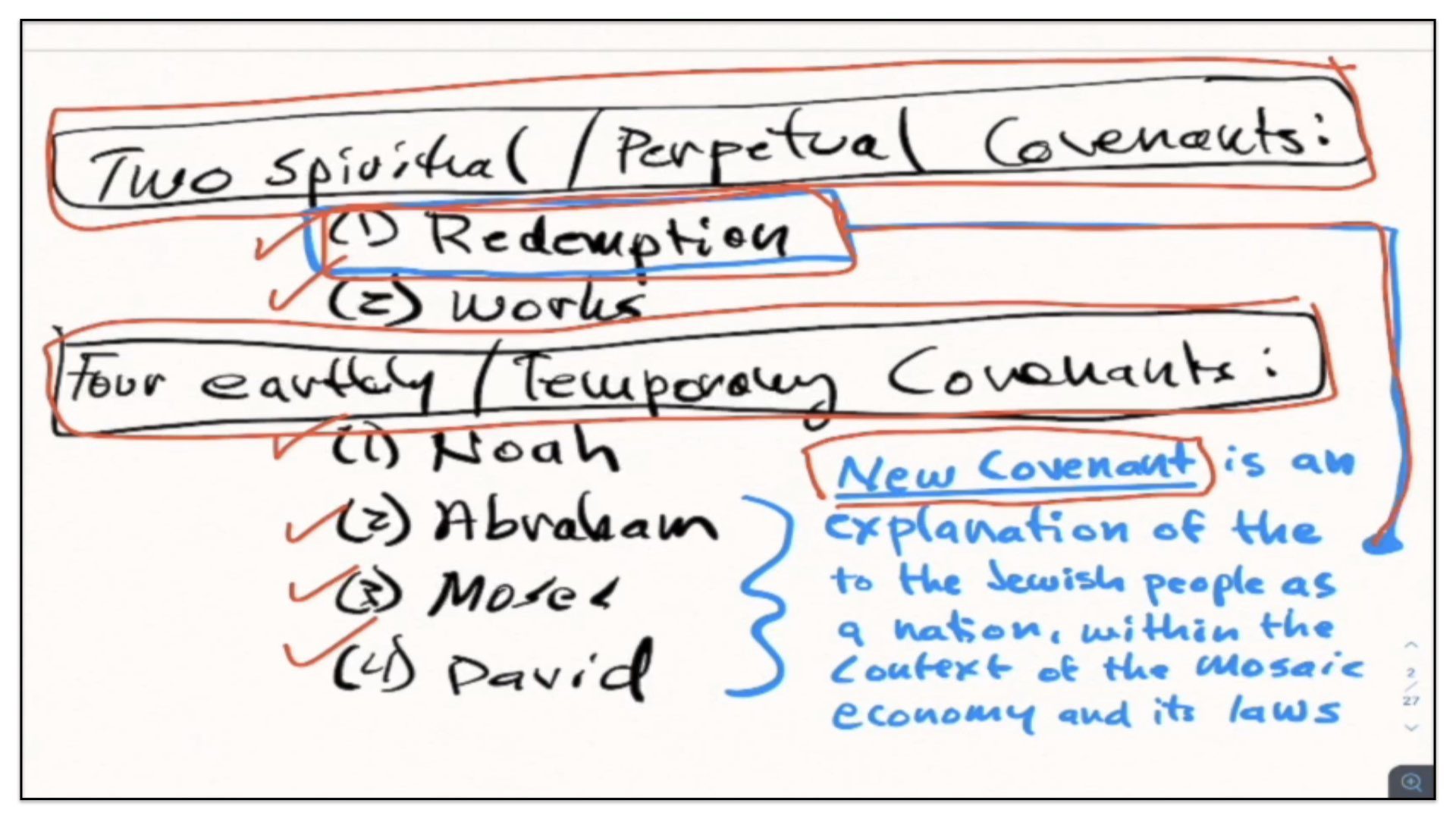 Now you see, if you now take the earthly covenants God has made, let’s say with Abraham, or with Moses or with David, and you somehow link those covenants with these two perpetual and spiritual covenants, you’re now undermining the integrity of these two spiritual and perpetual covenants. These spiritual and perpetual covenants stand alone and are separate, independent, autonomous from any other covenant mentioned in scripture.