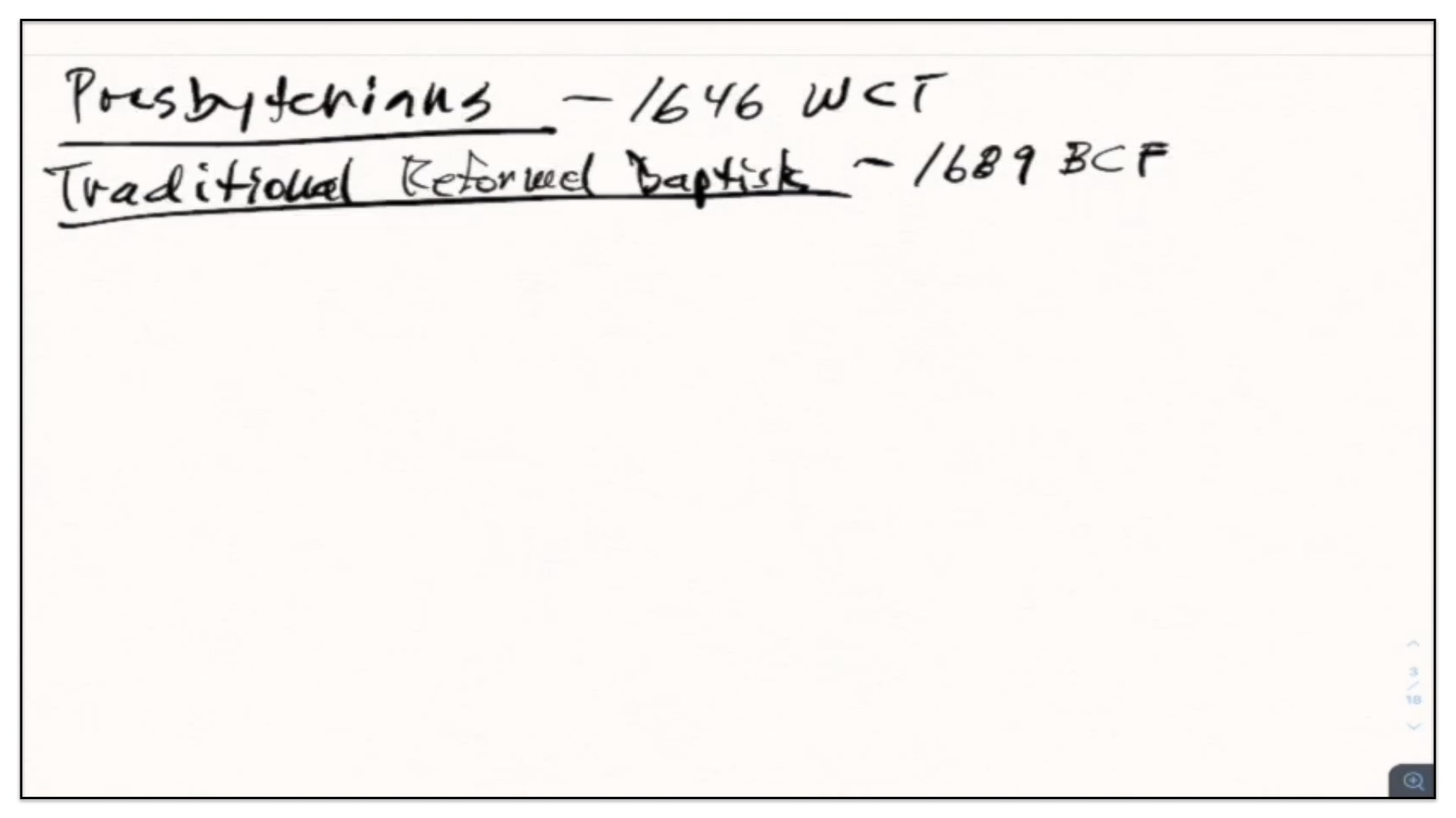 Let me mention a couple of other groups. I’m going to join these groups together. There’s the Presbyterians and their cousins, the traditional Reformed Baptists. Who are these two groups? Well, the Presbyterians, or Presbyterianism, originates in the 16th century Protestant Reformation, mainly with the teachings of John Calvin of Switzerland and John Knox of Scotland. Presbyterians are self-acclaimed Confessionalists. They hold to something called the 1646 Westminster Confession of Faith, and they believed that historic document is almost a perfect articulation of what they believe concerning the Bible and theology and the covenants. As for their cousins, the traditional Reform Baptists, I think it’s safe to say the Reformed Baptist movement began in the 1950’s, during the resurgence of Calvinism among the Baptist and Congregational churches. Some of the leading influencers at that time were men such as Iain Murray and Martyn Loyd-Jones, and influences among publications such as the Banner of Truth. Now, in my experience, Reformed Baptists tend to have more in common with Presbyterians than they do with their Baptist heritage. I therefore think it’s more accurate to refer to them as Reformed Presbyterians. And this is a case in point—traditional Reformed Baptists tend to agree with the Presbyterians on the number and arrangement of the covenants. Now, they do differ when you get into the finer print and detail of these issues, but generally speaking, I think it’s safe to clump them together. How do they view the covenants? Well, they believe that there are three major covenants. I’ll just draw, once again, a timeline. Mmm, let me back up. Oh, I should mention by the way. The traditional Reform Baptists are also self-acclaimed Confessionalists, and they hold to something called the 1689 London Baptist Confession of Faith. They love that document, just as the Presbyterians love the 1646 Confession, so these Reformed Baptists believe the 1689 is almost a perfect articulation of their faith when it comes to scripture and theology and the covenants. Well, back to their view of the covenants. I’ll just draw this timeline.