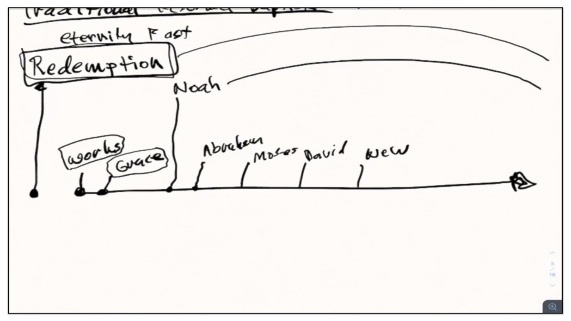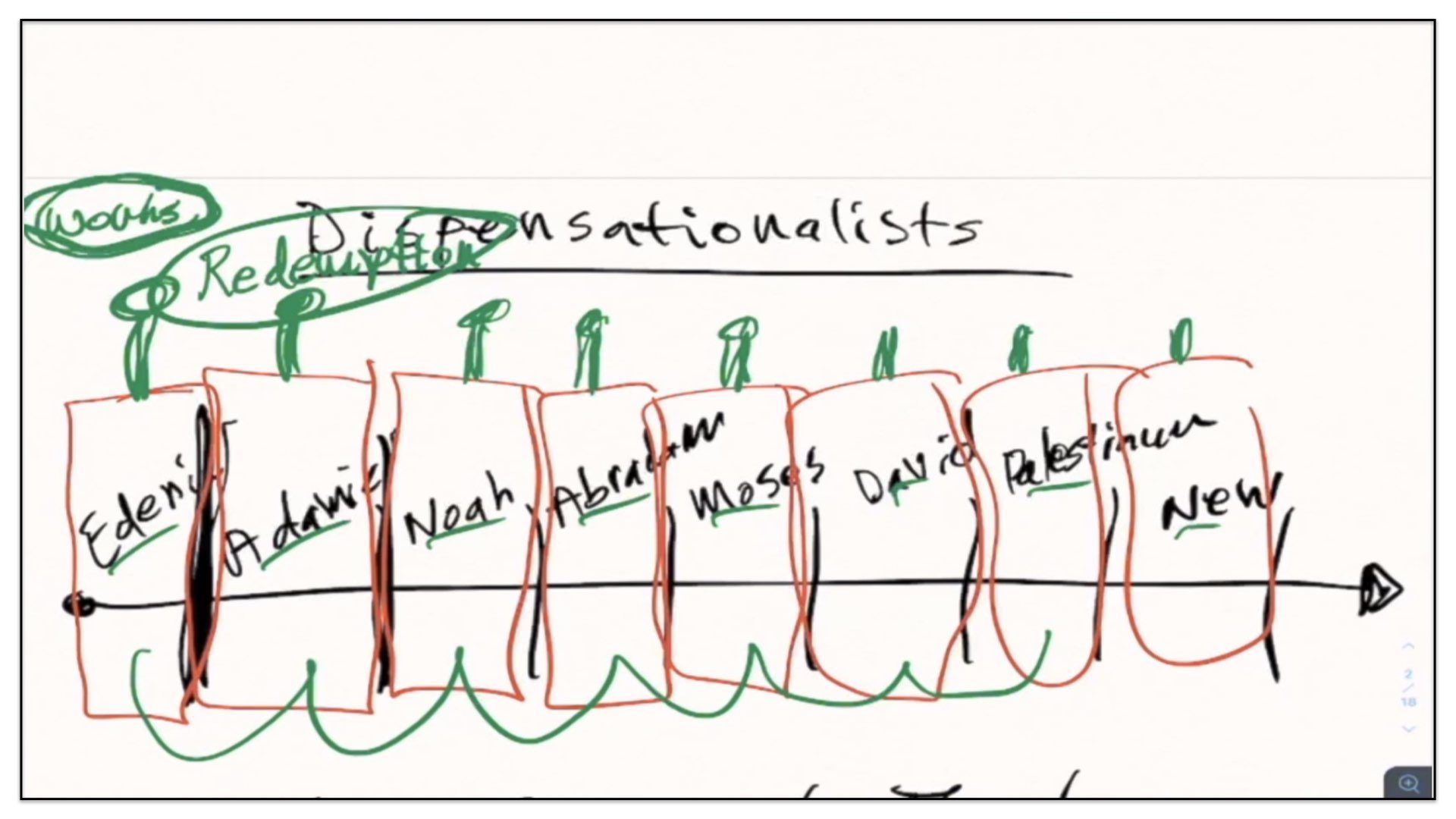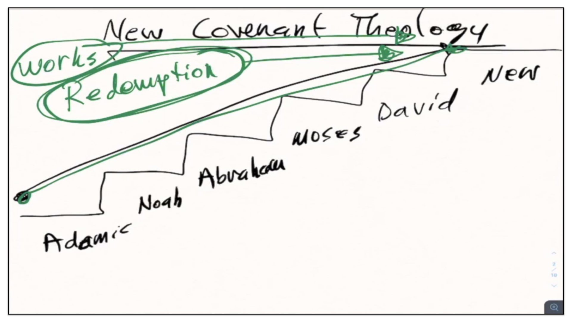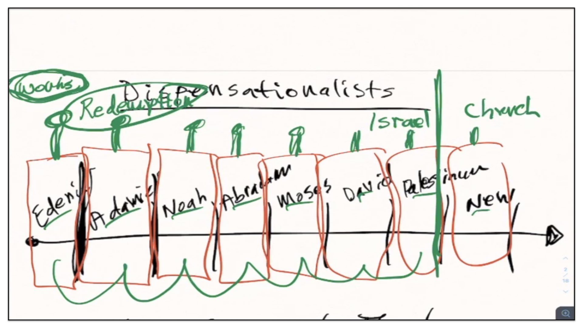 Well, let’s now take this outline and see if we can diagram it. Let me think how I’m gonna go about diagramming this. Let’s begin with a timeline. Right, let’s start with the two spiritual and perpetual covenants—Redemption and Works. And I’m going to draw them out here in our notes and our diagram. There’s the Covenant of Redemption. And there’s the Covenant of Works. And I say, the Covenant of Redemption is perpetual—it’s never ending; it’s everlasting. And so is the Covenant of works—perpetual, never ending, everlasting. Watch. Every unregenerate sinner throughout the course of history is under the authority of the Covenant of Works. And every regenerate sinner is under the authority of the Covenant of Redemption, otherwise known as the Covenant of Grace. Let’s not forget that. There’s different labels given to the Covenant of Redemption. It’s called the Covenant of Redemption, the Covenant of Peace, the Everlasting Covenant, the Covenant of Grace. If ever you hear me use those labels, I’m referring to this one covenant—the Covenant of Redemption, the agreement between the Father, Son and Spirit and under which all regenerate sinners are in relationship with God.