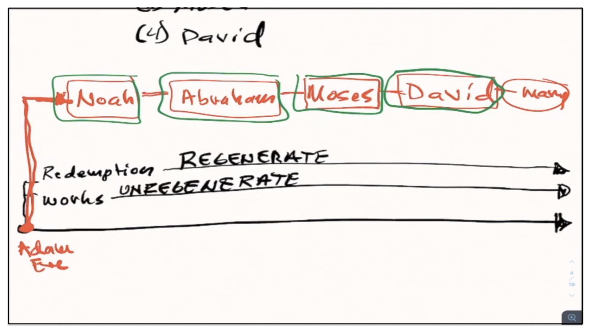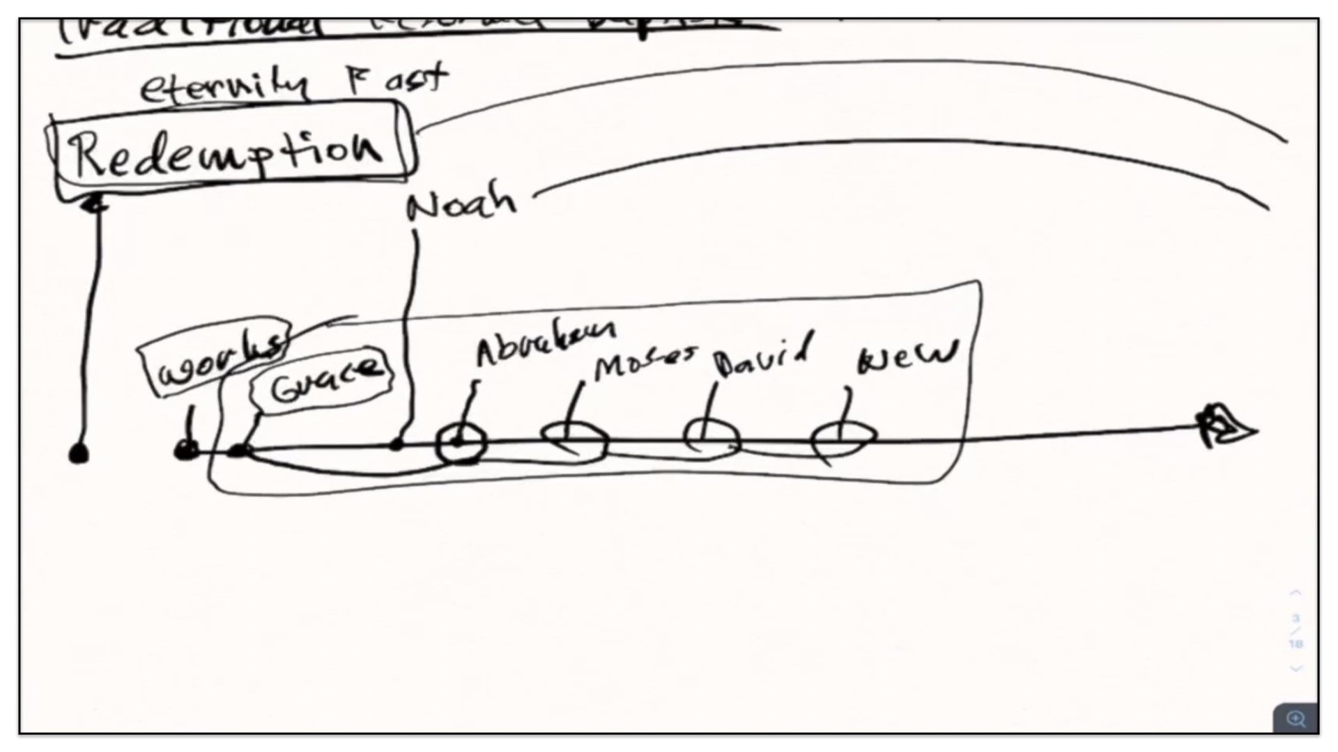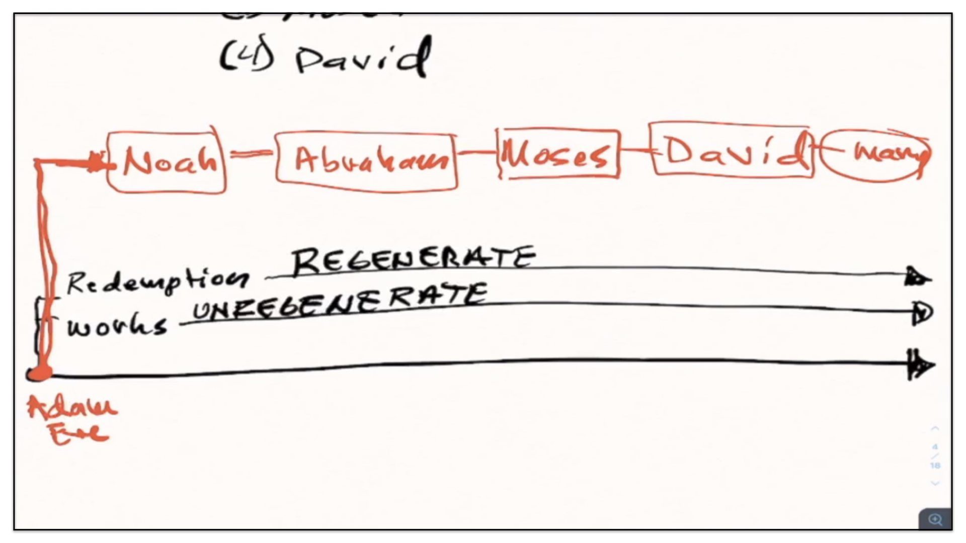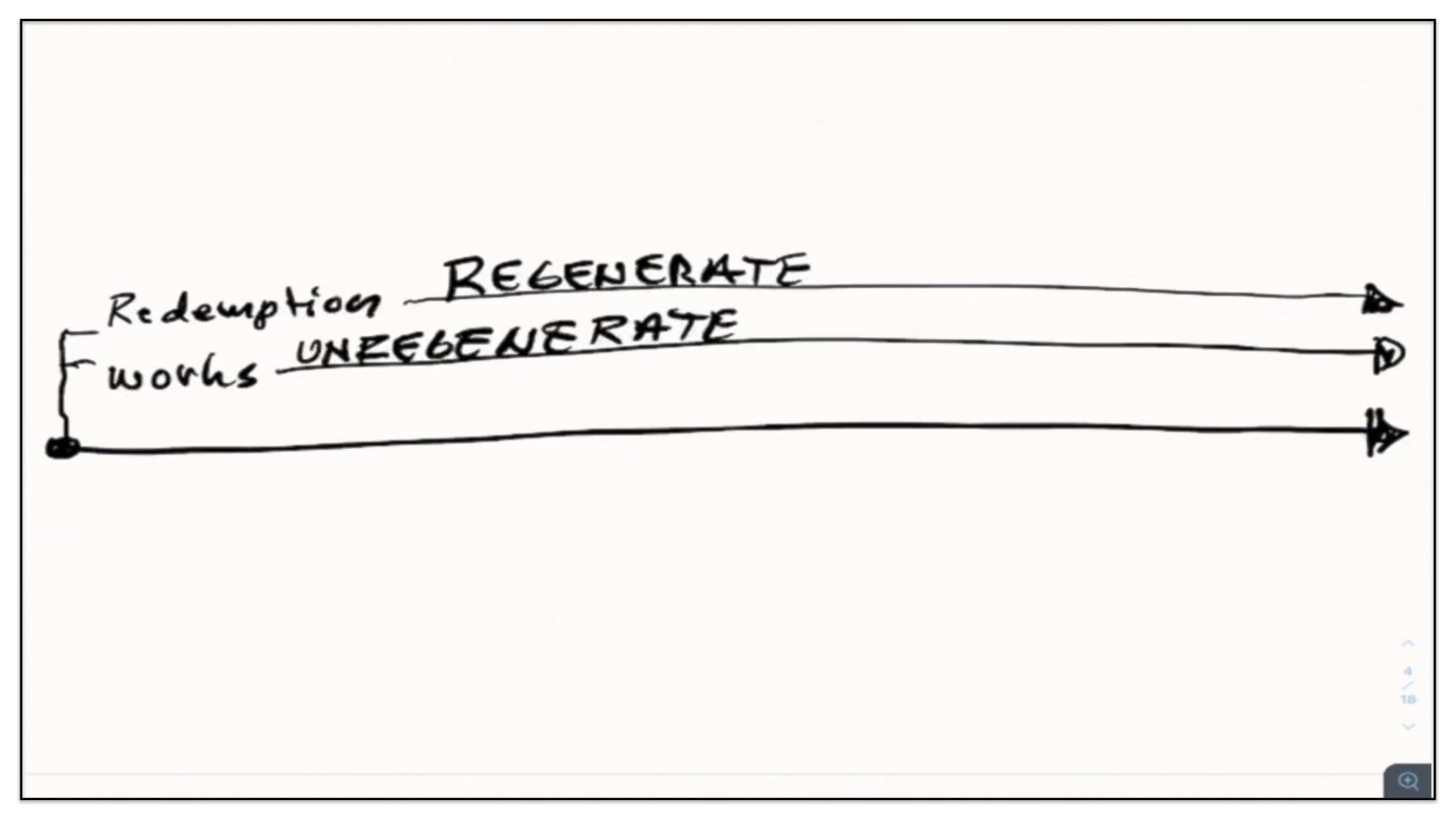 Well, let’s now take this outline and see if we can diagram it. Let me think how I’m gonna go about diagramming this. Let’s begin with a timeline. Right, let’s start with the two spiritual and perpetual covenants—Redemption and Works. And I’m going to draw them out here in our notes and our diagram. There’s the Covenant of Redemption. And there’s the Covenant of Works. And I say, the Covenant of Redemption is perpetual—it’s never ending; it’s everlasting. And so is the Covenant of works—perpetual, never ending, everlasting. Watch. Every unregenerate sinner throughout the course of history is under the authority of the Covenant of Works. And every regenerate sinner is under the authority of the Covenant of Redemption, otherwise known as the Covenant of Grace. Let’s not forget that. There’s different labels given to the Covenant of Redemption. It’s called the Covenant of Redemption, the Covenant of Peace, the Everlasting Covenant, the Covenant of Grace. If ever you hear me use those labels, I’m referring to this one covenant—the Covenant of Redemption, the agreement between the Father, Son and Spirit and under which all regenerate sinners are in relationship with God.