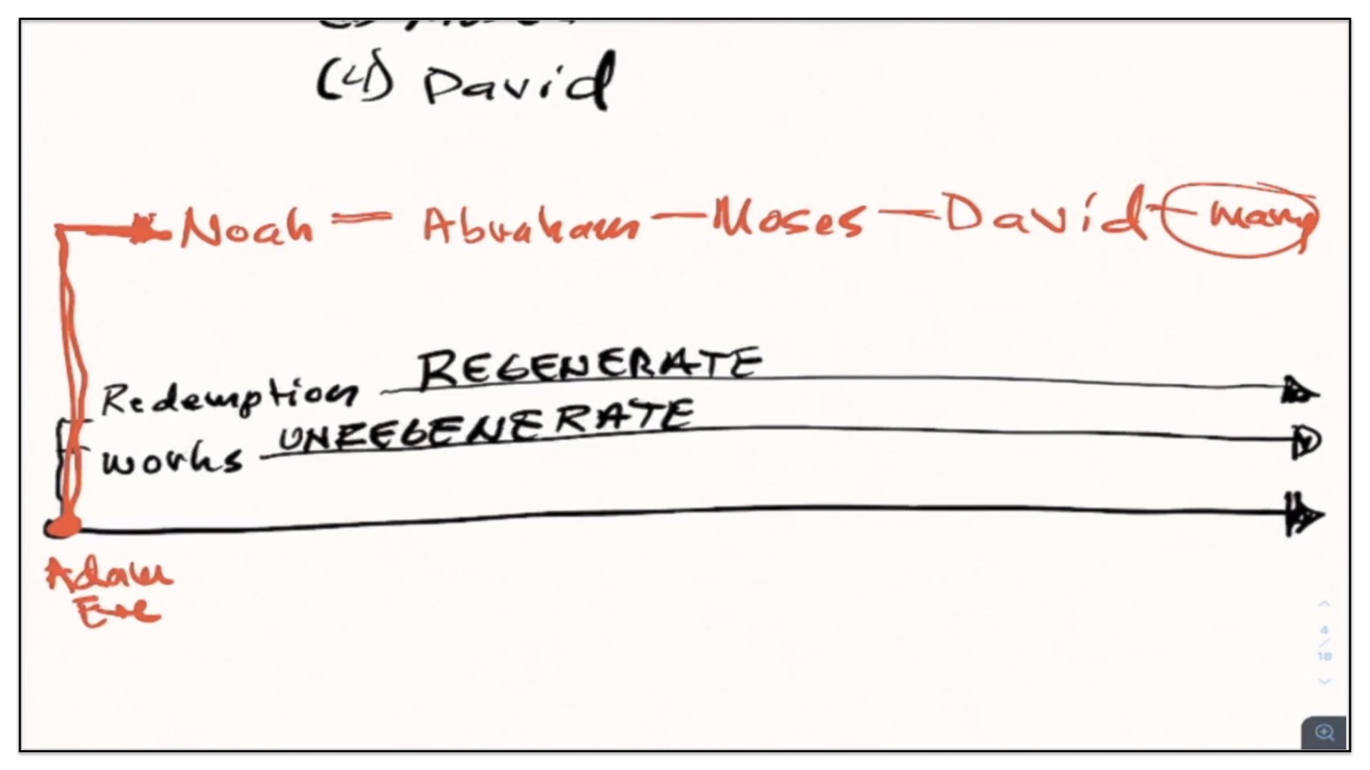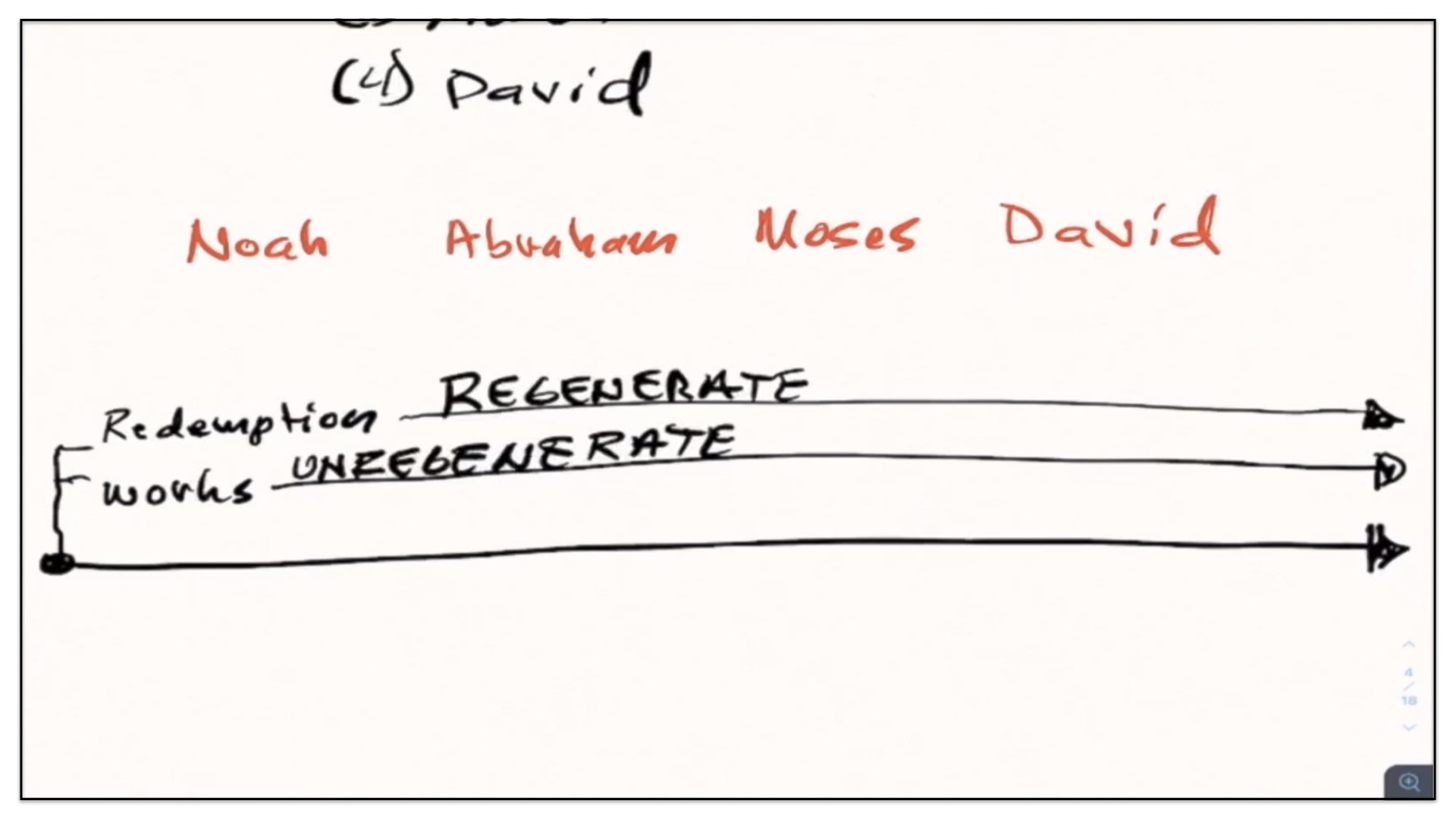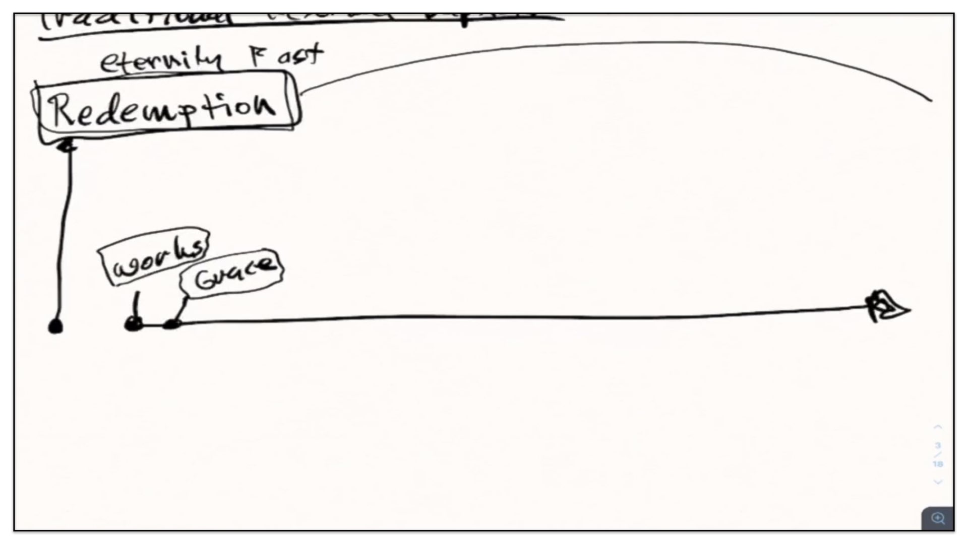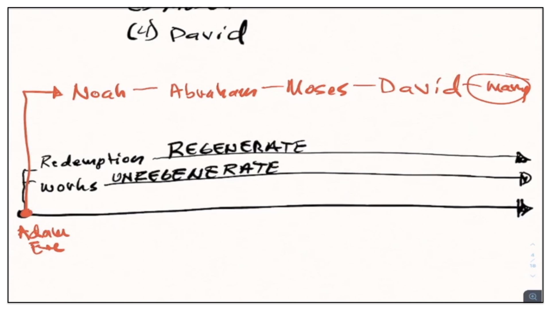 Well, let’s now take this outline and see if we can diagram it. Let me think how I’m gonna go about diagramming this. Let’s begin with a timeline. Right, let’s start with the two spiritual and perpetual covenants—Redemption and Works. And I’m going to draw them out here in our notes and our diagram. There’s the Covenant of Redemption. And there’s the Covenant of Works. And I say, the Covenant of Redemption is perpetual—it’s never ending; it’s everlasting. And so is the Covenant of works—perpetual, never ending, everlasting. Watch. Every unregenerate sinner throughout the course of history is under the authority of the Covenant of Works. And every regenerate sinner is under the authority of the Covenant of Redemption, otherwise known as the Covenant of Grace. Let’s not forget that. There’s different labels given to the Covenant of Redemption. It’s called the Covenant of Redemption, the Covenant of Peace, the Everlasting Covenant, the Covenant of Grace. If ever you hear me use those labels, I’m referring to this one covenant—the Covenant of Redemption, the agreement between the Father, Son and Spirit and under which all regenerate sinners are in relationship with God.