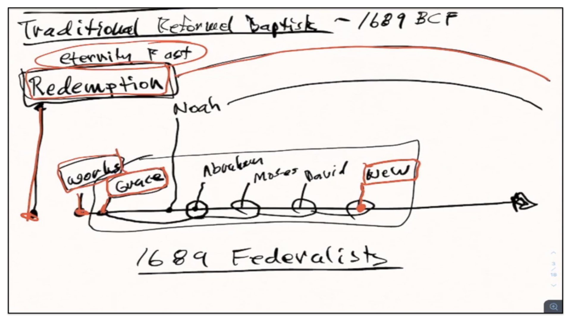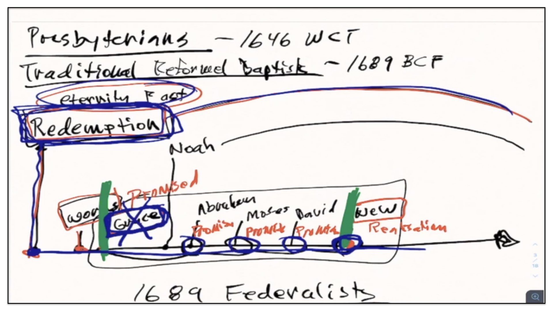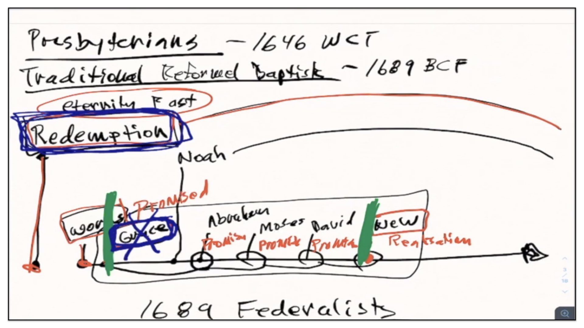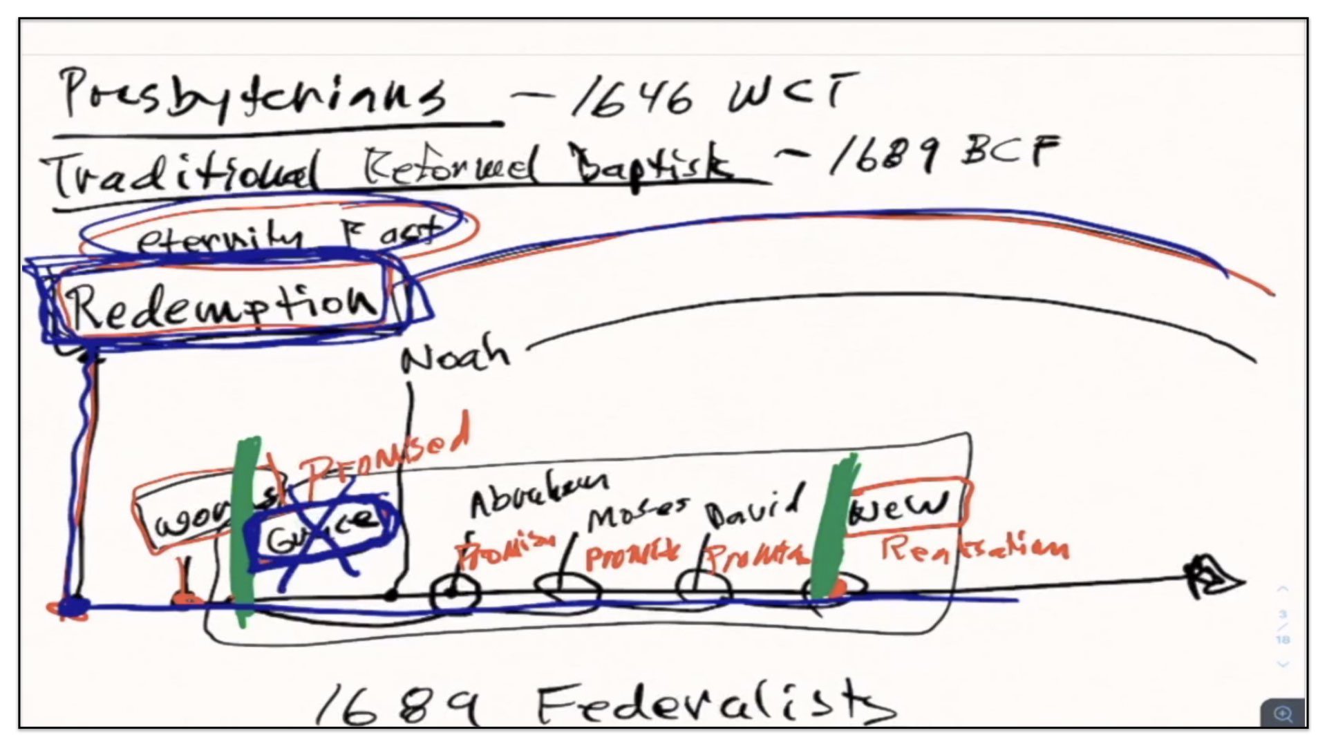 I think it’s good if I just back up and use the framework for the previous groups—Presbyterians and the traditional Reform Baptists—I’ll use this framework to explain what it is the 1689 Federalists believe. In essence—I’ll just change the color pen here. In essence, the Federalists—that’s what I’ll call them for short—the Federalists agree with quite a few things as it appears on this diagram, or chart of the traditional Reformed Baptists’ view on the covenants. For example, they also believe in a Covenant of Redemption. They believe that Covenant of Redemption exists in eternity past. They therefore view it as in the background of time and events. The Federalists also believe in a Covenant of Works that God made with Adam, before the Fall. However, and this is where things start to differ, they do not believe this conditional covenant—well, let me back up and say they agree with Presbyterians and traditional Reform Baptists that there is a conditional Covenant of Grace. They agree with that.