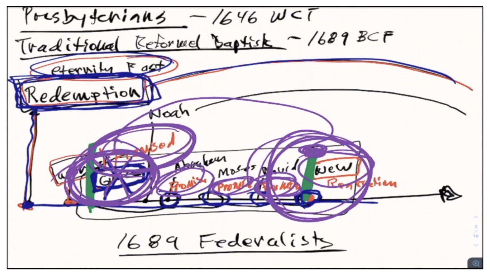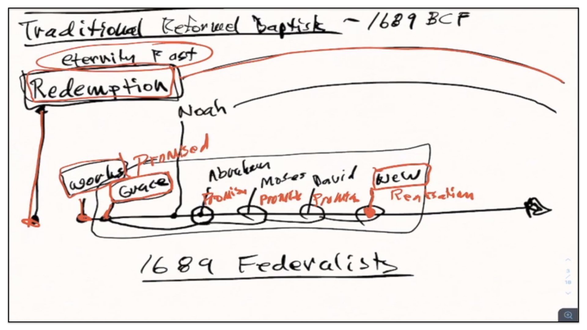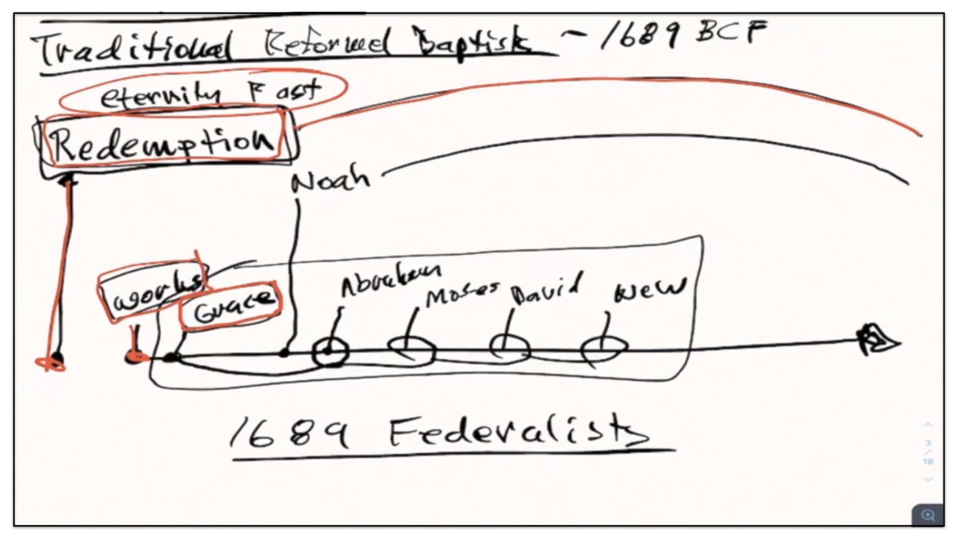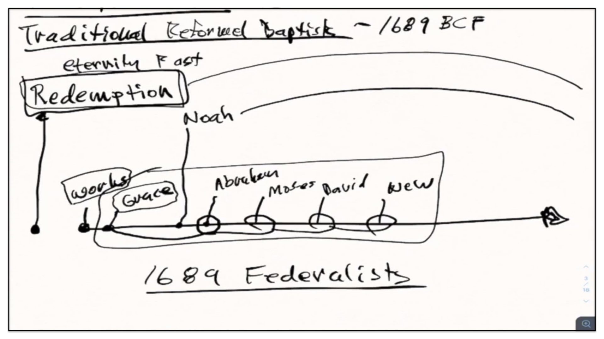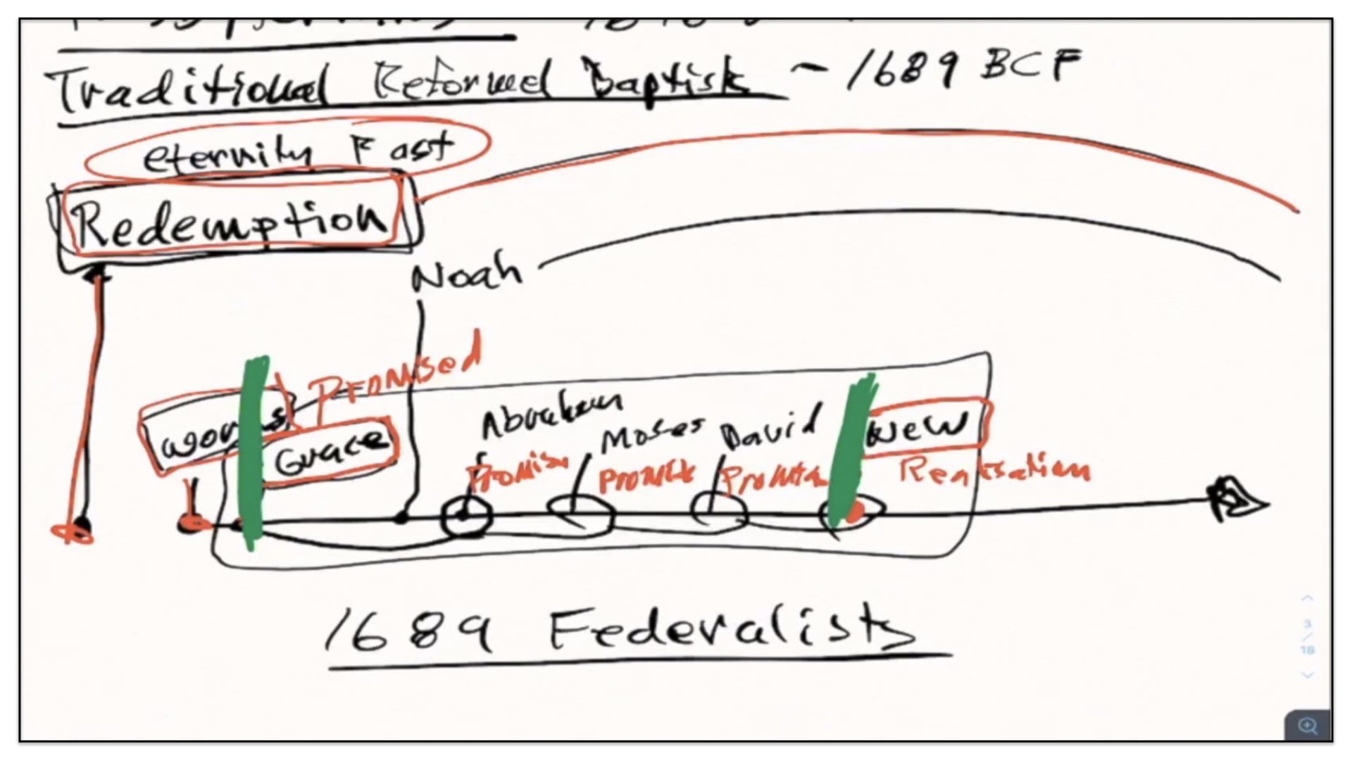 I think it’s good if I just back up and use the framework for the previous groups—Presbyterians and the traditional Reform Baptists—I’ll use this framework to explain what it is the 1689 Federalists believe. In essence—I’ll just change the color pen here. In essence, the Federalists—that’s what I’ll call them for short—the Federalists agree with quite a few things as it appears on this diagram, or chart of the traditional Reformed Baptists’ view on the covenants. For example, they also believe in a Covenant of Redemption. They believe that Covenant of Redemption exists in eternity past. They therefore view it as in the background of time and events. The Federalists also believe in a Covenant of Works that God made with Adam, before the Fall. However, and this is where things start to differ, they do not believe this conditional covenant—well, let me back up and say they agree with Presbyterians and traditional Reform Baptists that there is a conditional Covenant of Grace. They agree with that.