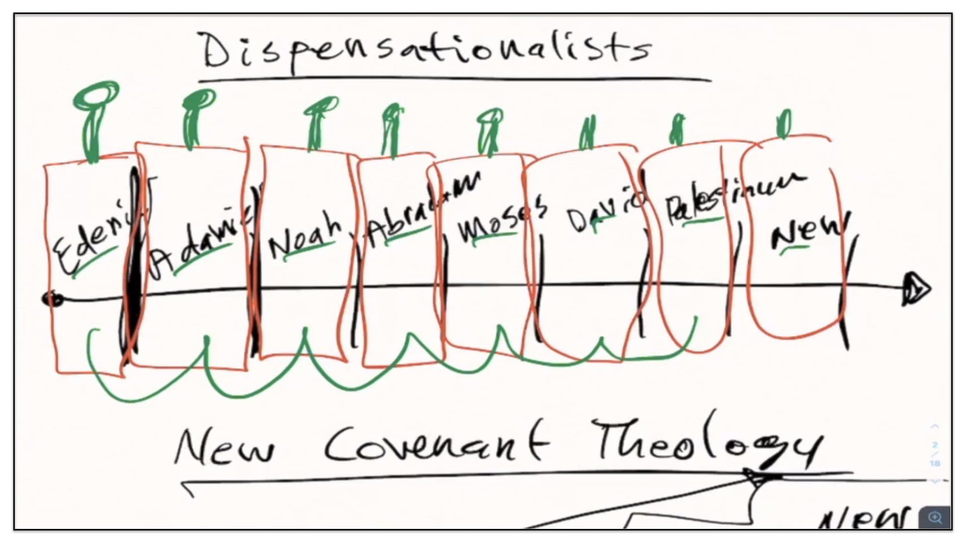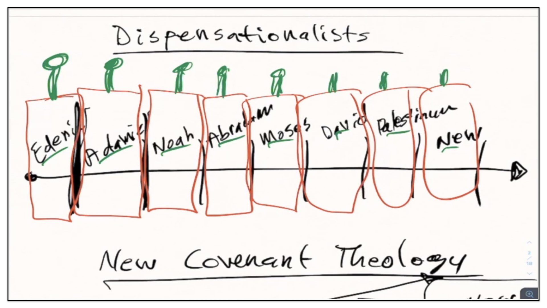 The first of these groups are what are called Dispensationalists. It’s a long word. Modern dispensationalism was formulated by a man named John Darby, in the early to mid part of the 19th century. And now, in the 21st century, it’s safe to say that this viewpoint now dominates Evangelical churches. What exactly do they believe? In a nutshell, the Dispensationalists believe that God relates to the human race—that’s a timeline by the way; forgive me, in these notes, I’ve explained in the previous studies, I’m out of time in the busy schedule I’m keeping for this month and probably the first part of next month, and therefore I haven’t had the time to present polished notes as usual; so you’re gonna have to bear with me as I make the notes as we go along; I can only hope the notes are clear to you and that I won’t cause more confusion by using the notes than if I forgo the notes; I’ll use the notes and hope they make a difference and be a help to you; so this is a timeline I’ve drawn on the screen—and as I’ve said, the Dispensationalists believe that God relates to the human race in different ways, according to specific time periods throughout the course of history. And then they believe that within each of these time periods, there are covenants that govern the people. Most, or I should say many, Dispensationalists believe there are at least eight major covenants. Allow me to highlight them for you. They believe the first of these covenants is what’s called The Edenic Covenant, or the covenant made in the Garden of Eden; and then there’s the Adamic Covenant; and then the Noahic Covenant; the covenant God made with Abraham, then with Moses, then with David. Then they have something called the Palestinian Covenant. And then finally, they believe in something called the New Covenant. Now, the Dispensationalists will view these covenants to be distinct covenants, existing within their own time periods. There’s very little continuity between one covenant and the next. Each covenant comes to an end whenever that time period finishes and the new covenant begins. I like to view the Dispensational concept, or arrangement of the covenants as airtight compartments. You’re familiar with the Titanic. I think the Titanic had 16 airtight compartments in the lower part of the deck, so that in the event the ship would strike a, let’s say an iceberg head on, if the first couple of compartments were compromised, the other compartments in the bottom part of the deck of the ship could be closed off and that would allow the ship to remain afloat until they made it safely to shore. Of course, in the case of the Titanic, the ship struck an iceberg along the side and therefore it pierced a hole along several of those compartments and it compromised the integrity of the ship, which as you know, it eventually sank. I shouldn’t have gone into all that detail, but I’ve done so just to illustrate for you that it appears to me that the Dispensationalists believe that each of these covenants exist in a time-tight compartment—an airtight compartment—they exist within their own little period of time and there’s little overlap from one to the other. Now, generally speaking, that’s how I would explain the general view of the Dispensationalists, when it comes to the subject of the covenants, their number and their arrangement.