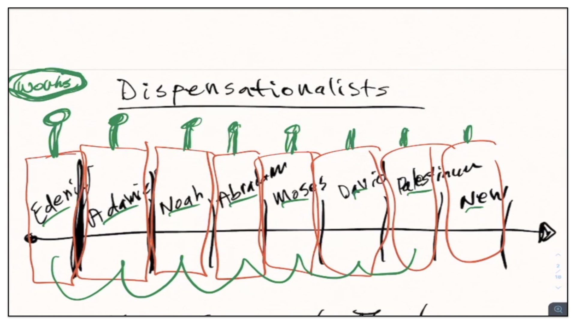I’d like to begin with Dispensationalism. The first thing I’ll point out about Dispensationalism. Let me change, I’ve got a different color pen, we’ll use the color green to point out my disagreements. First of all, I’d like you to notice the Dispensationalists believe that man is responsible to God under the authority of dispensations, periods of time, and that God imposes certain duties and responsibilities on man within those dispensations. They do not believe that man is held accountable to God under the basic parameters of a covenant, although they do incorporate the idea of a covenant within their framework. Now listen, on that basis alone, I believe this entire framework is erroneous. As I mentioned at the beginning, every relationship is based upon the authority of a covenant. Not a dispensation.