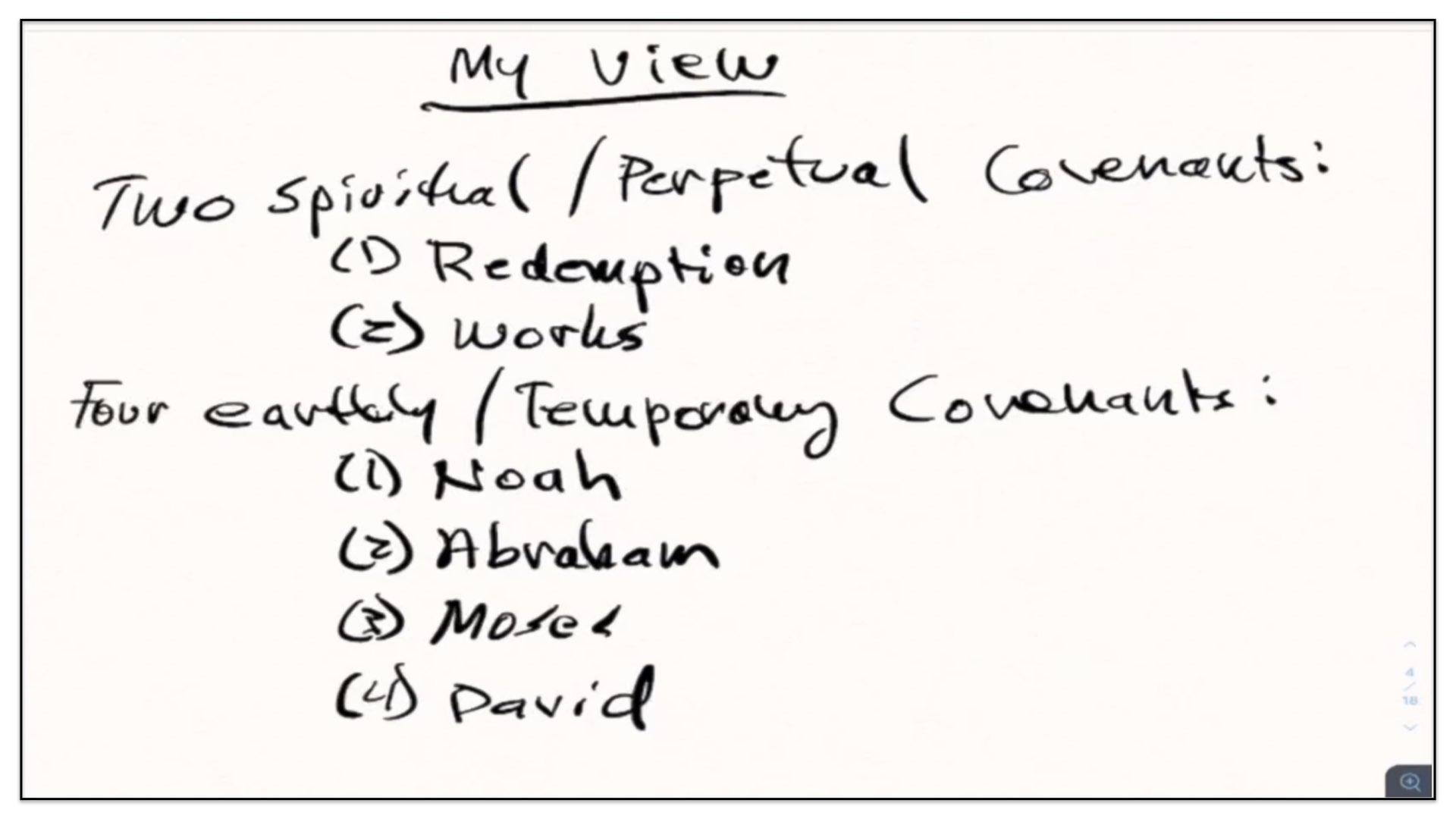 So, here’s the outline of my view. I believe that there are two spiritual and perpetual covenants. The first of these is called the Covenant of Redemption. The second is called the Covenant of Works. Unchanging Covenants. And then I believe there are four earthly and temporary covenants. These would be the covenant God made with Noah, the covenant God made with Abraham, the covenant God made with David and the covenant God made—I should back up, I’ve skipped one—covenant God made with Moses, and the covenant God made with David. In a nutshell, that’s my view outlined. That’s what I believe about the covenants: Two spiritual and perpetual covenants—Redemption and Works; and then four earthly and temporary covenants—that with Noah, Abraham, Moses and David.