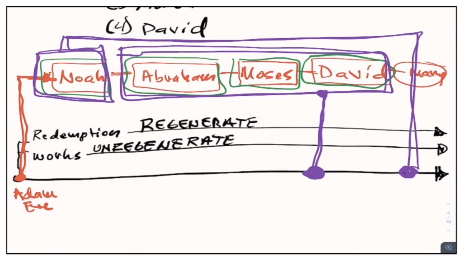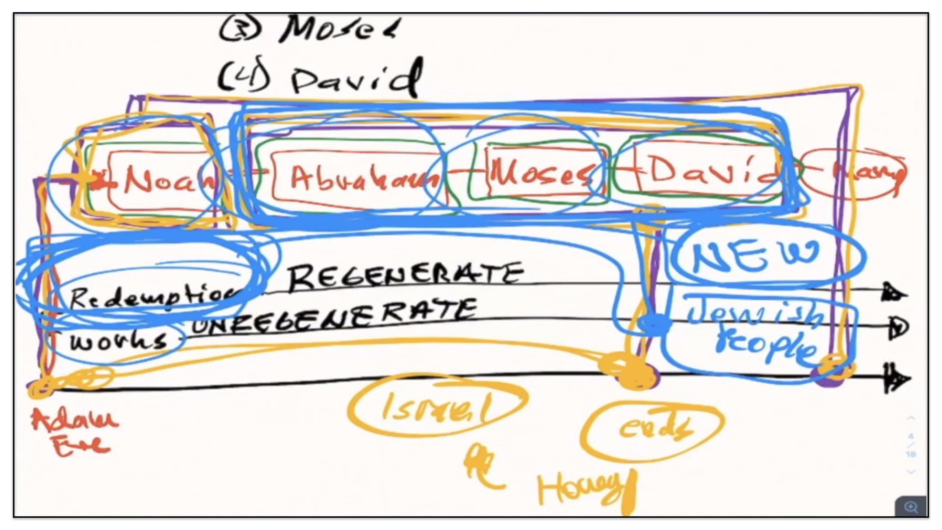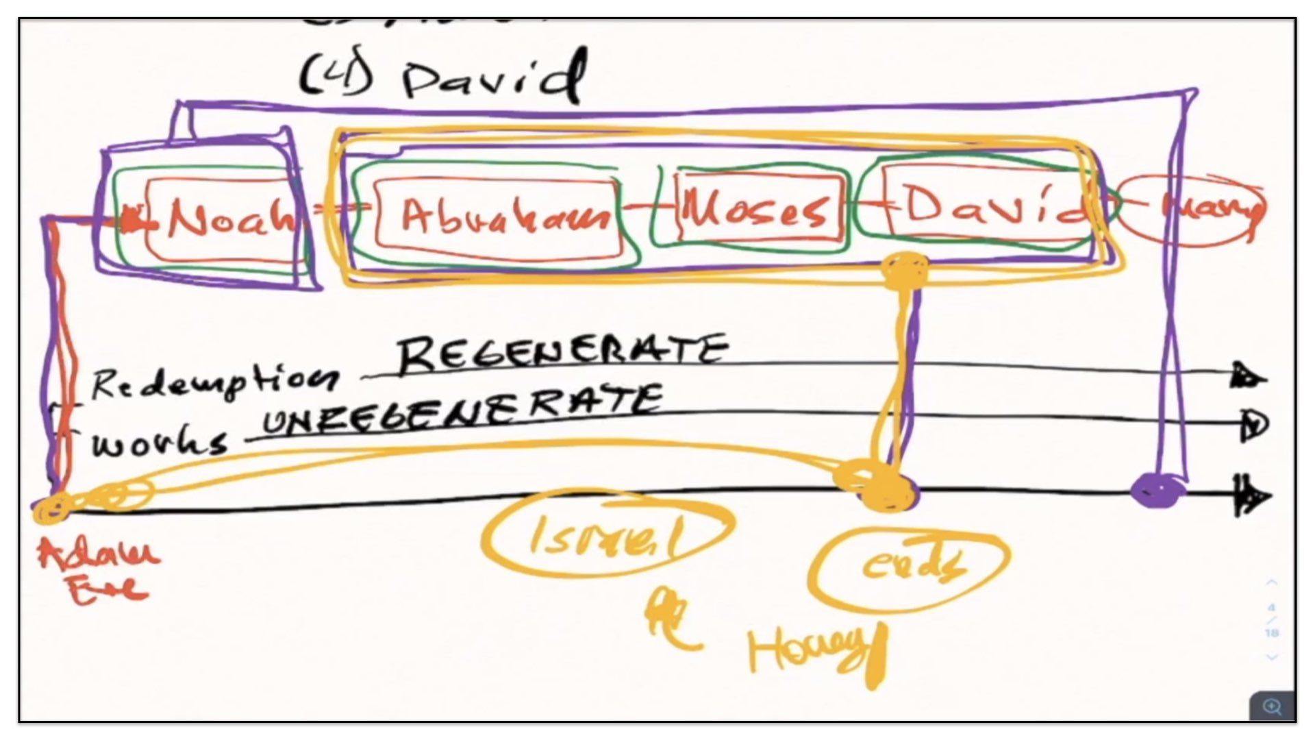 Now, the third thing I would like you to notice about these four covenants—all four covenants point to the coming Messiah. Take, for instance—I’ll change the color pen, purple—take for instance, these last three earthly covenants—Abraham, Moses and David. These covenants point to the first coming of Christ—the first coming of the Messiah. However, the earthly covenant God made with Noah, it points to the second coming of the Messiah. “But how so,” you say. “Doesn’t the covenant God made with Noah only promise that God will not again destroy the earth with a worldwide flood for man’s sake?” And of course, yes, that’s true. God makes that promise. But if you read carefully—I believe it’s Genesis chapter 8—if you read carefully, the promise God gives, He qualifies it by explaining that this covenant will be active until the end of the current form in which this earth exists. And then, if you were to read the letters of Peter, Peter points out that when the Lord Jesus Christ will come again, He will with fire destroy this earth and then remake it. And you see, therefore, you have in the covenants made with Abraham Moses and David—it points to the first coming of the Messiah; whereas the covenant God made with Noah points to the second coming of the Messiah. It’s all about this promise in Genesis chapter 3 and verse 15 of the coming Messiah, whether it be His first coming or His second coming.