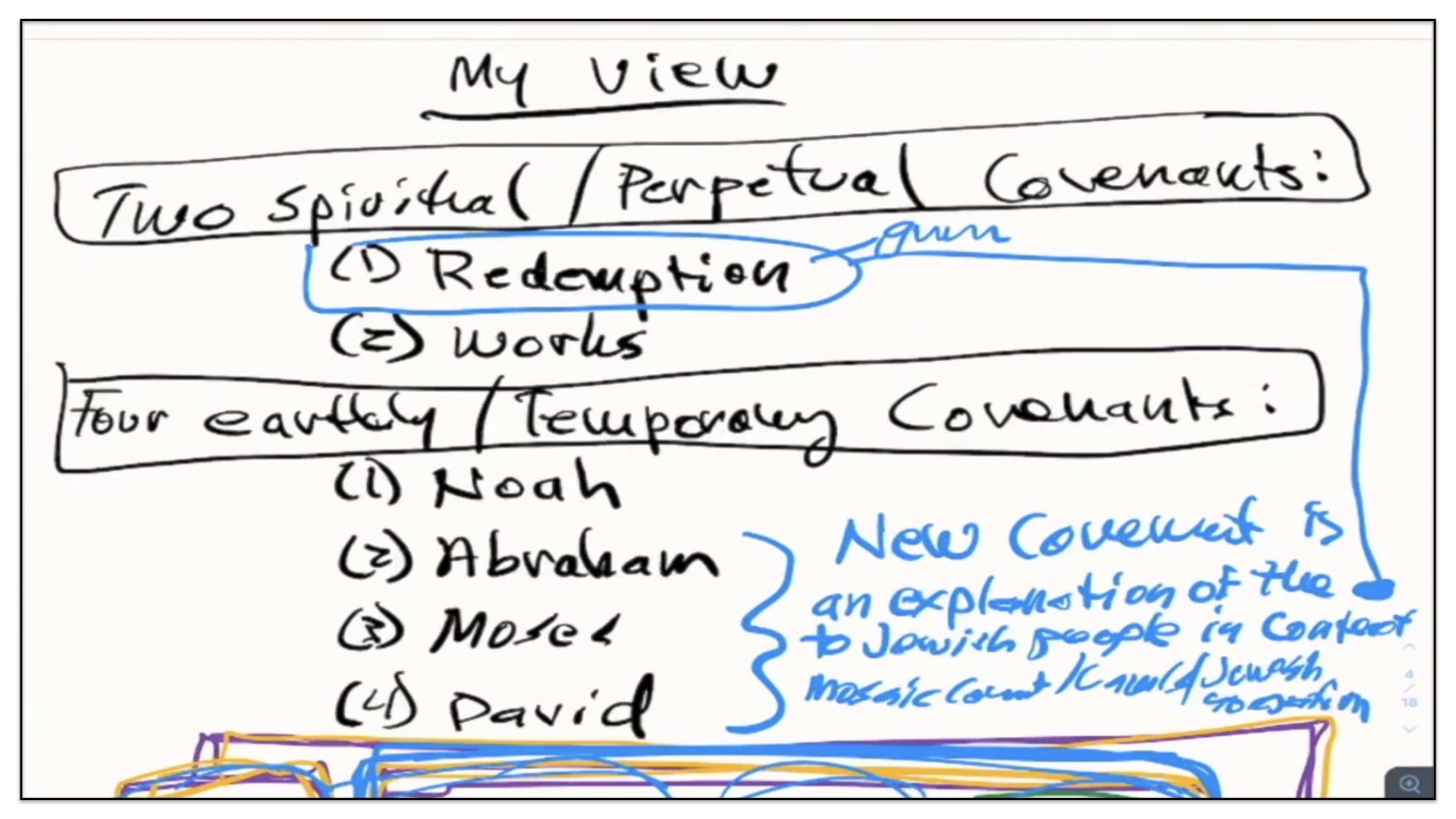 I’ll change the color pen to purple. Look, they make the same mistake as the other groups. They believe in a conditional Covenant of Grace. Now, of course, their big point—and they’re very chuffed by this—they believe that that conditional Covenant of Grace was established at mount Calvary instead of the garden of Eden. And to be honest, if I was to take one of the other of these views, I think I’d probably lean towards the 1689 Federalists. They make a valid argument. But I don’t believe there is a conditional Covenant of Grace, and therefore it doesn’t matter if it began in the garden of Eden or at mount Calvary. It simply doesn’t exist. And therefore, what the 1689 Federalists believe about a promised conditional Covenant of Grace in all of these succeeding covenants leading up to the New Covenant, their understanding is incorrect. If there is no conditional Covenant of Grace, then it is not promised in the covenants God made with Abraham, Moses or David and neither is the New Covenant that conditional Covenant of Grace. Those are some of the reasons I would dismiss the 1689 Federalists’ views on the number and ordering of the covenants.