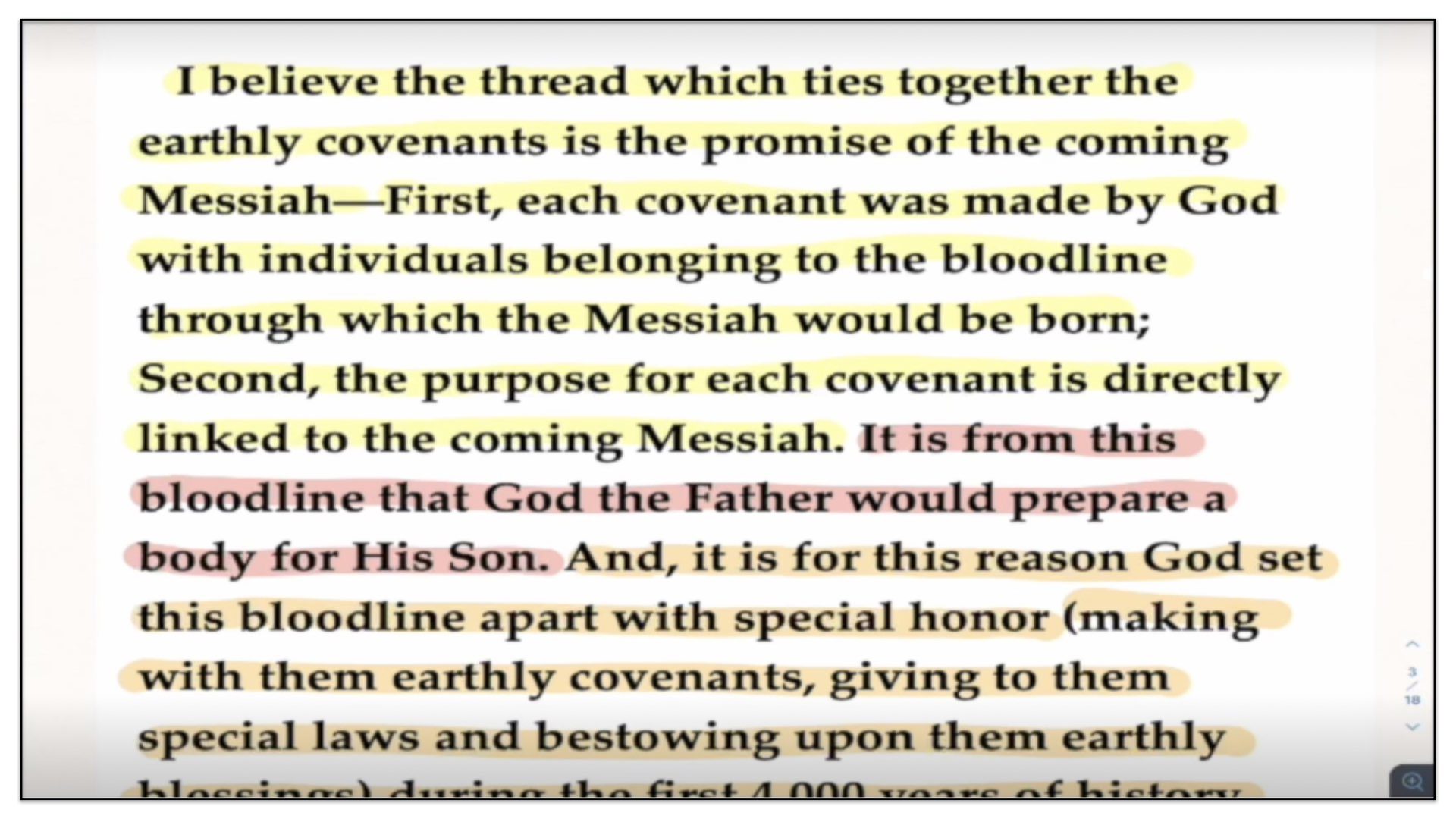 “I believe the thread which ties together the earthly covenants is the promise of the coming Messiah. First, each covenant was made by God with individuals belonging to the bloodline through which the Messiah would be born. Second, the purpose for each covenant is directly linked to the coming of the Messiah. It’s from this bloodline that God the Father would prepare a body for His Son.”