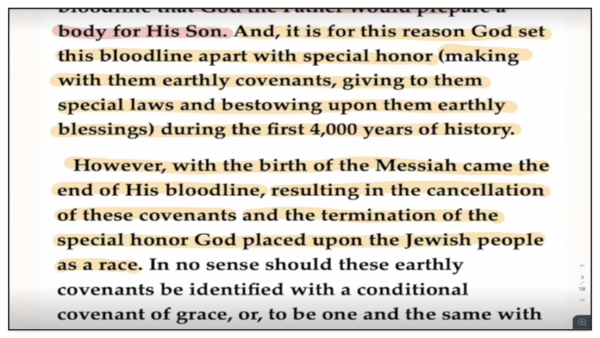 “It’s for this reason God set this bloodline apart with special honor (making with them earthly covenants, giving to them special laws and bestowing upon them earthly blessings) all of which occurred during the first 4,000 years of history, prior to the birth of Christ. However, with the birth of the Messiah came the end of His bloodline, resulting in the cancellation of these covenants together with the termination of the special honor God placed upon the Jewish people as a race.”