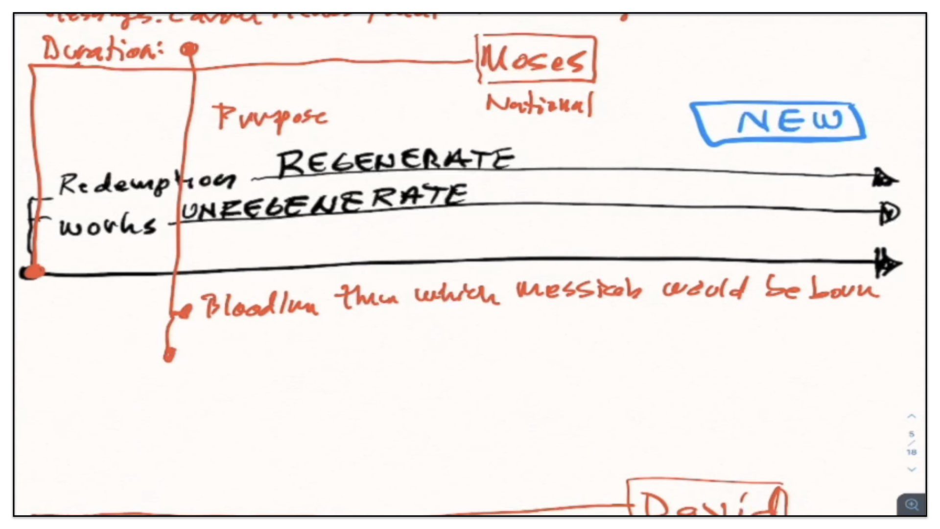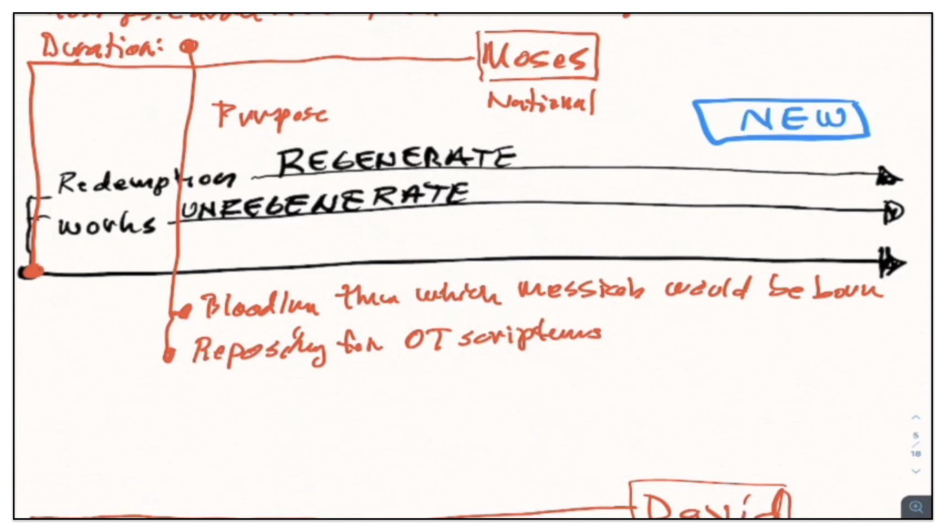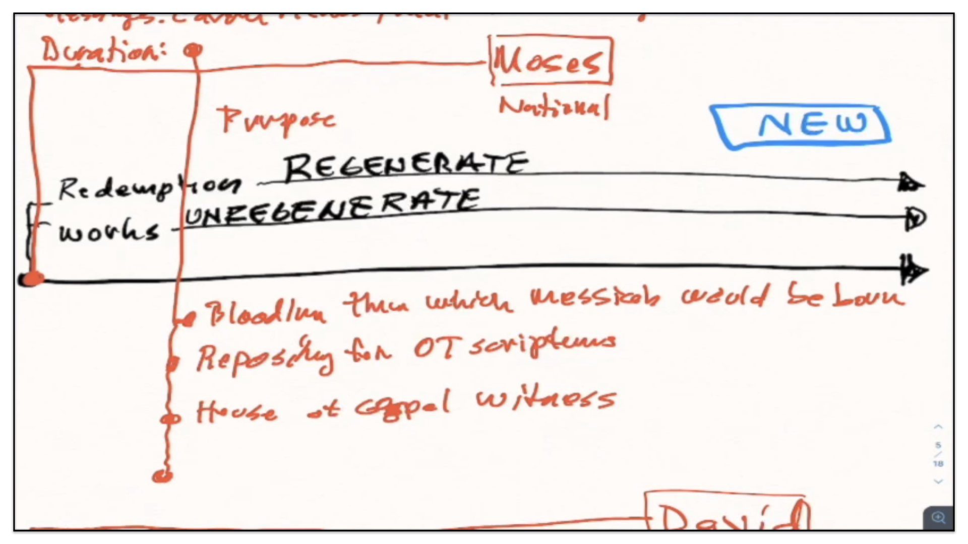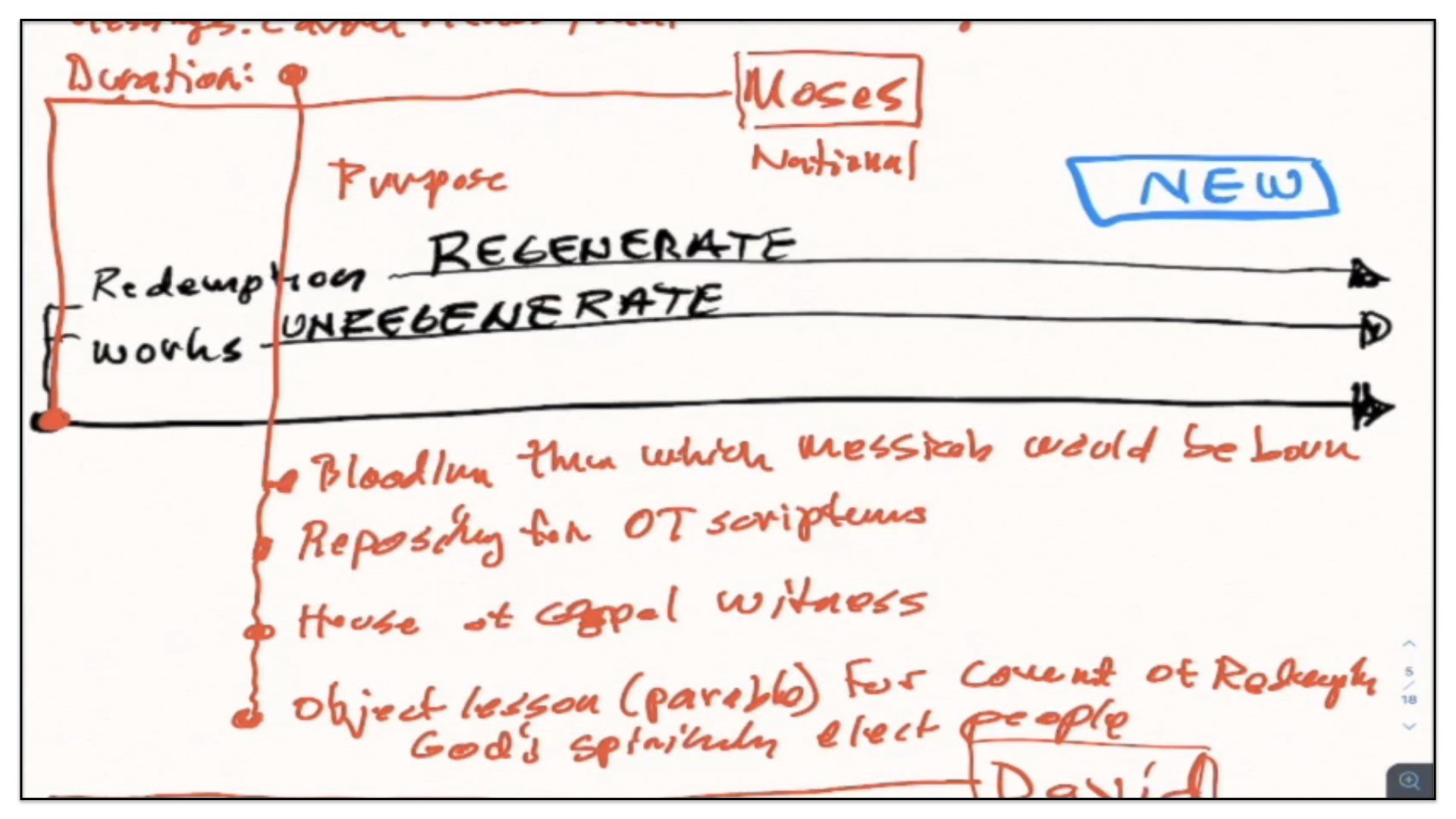 The fourth purpose God established the Mosaic Covenant was this, and I’ve just touched upon it—the Jewish people as a nation were to serve as an object lesson, an object lesson for what? An object lesson, we can say parable, it’s the same thing, they were to be a parable or an object lesson for two things. First, for the Covenant of Redemption; and secondly, for God’s spiritually elect people. What does that mean? It means when we read the Old Testament scriptures, the Mosaic Covenant illustrates the Covenant of Redemption. Portions of it does. I mean, the Jewish people as a nation were under that covenant; that’s their relationship to God under that covenant. And then there was the gospel house of witness within the Mosaic Covenant. And in some ways that resembles the relationship that we who are God’s spiritually elect people have with the Lord under the Covenant of Redemption. Again, the Jewish people as a nation were God’s physically elect people; they were elected on the basis of their race; the Messiah’s physical family bloodline. Whereas God’s spiritually elect people were elected on the basis of grace; God’s grace, under the Covenant of Redemption. You see the distinction between those, how one is an illustration of the other. And that’s ultimately for our benefit what we can derive from the Old Testament scriptures. We’re able to learn from the Old Testament scriptures as an object lesson, the great love wherewith the Lord loves us according to the Covenant of Redemption.