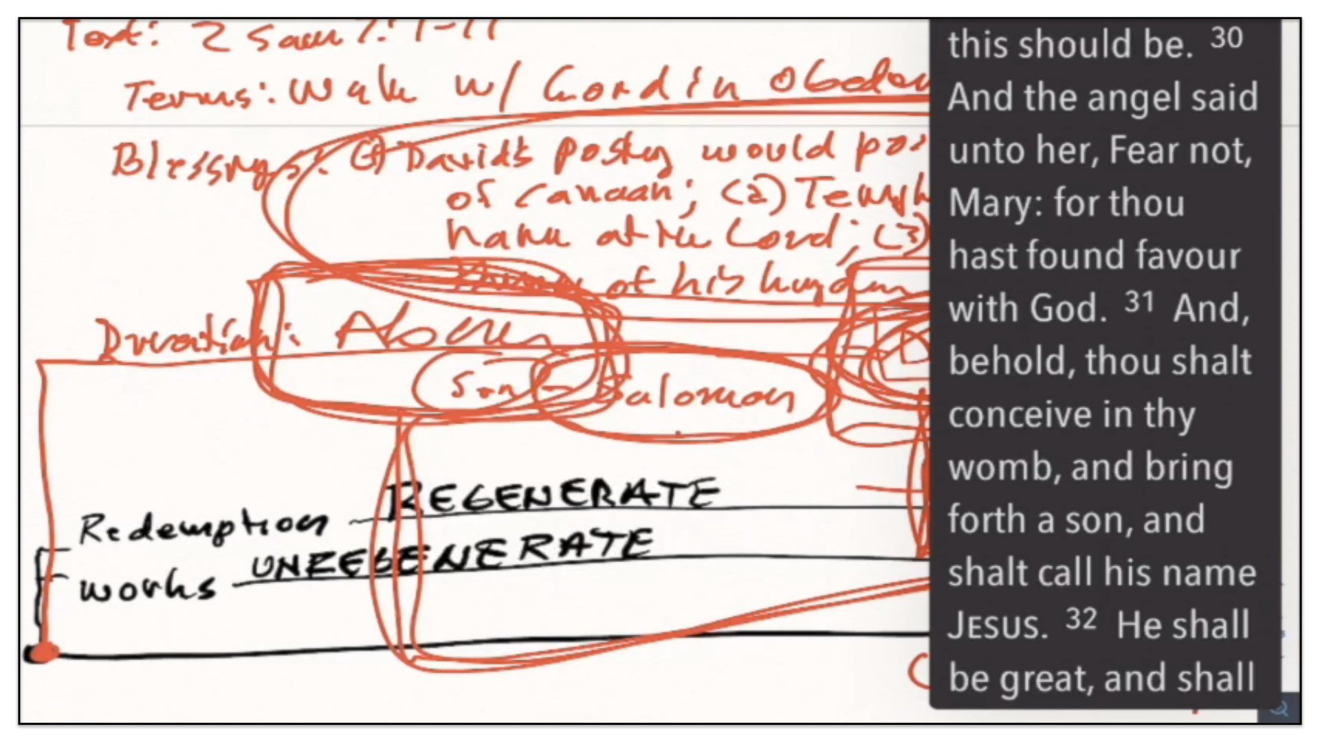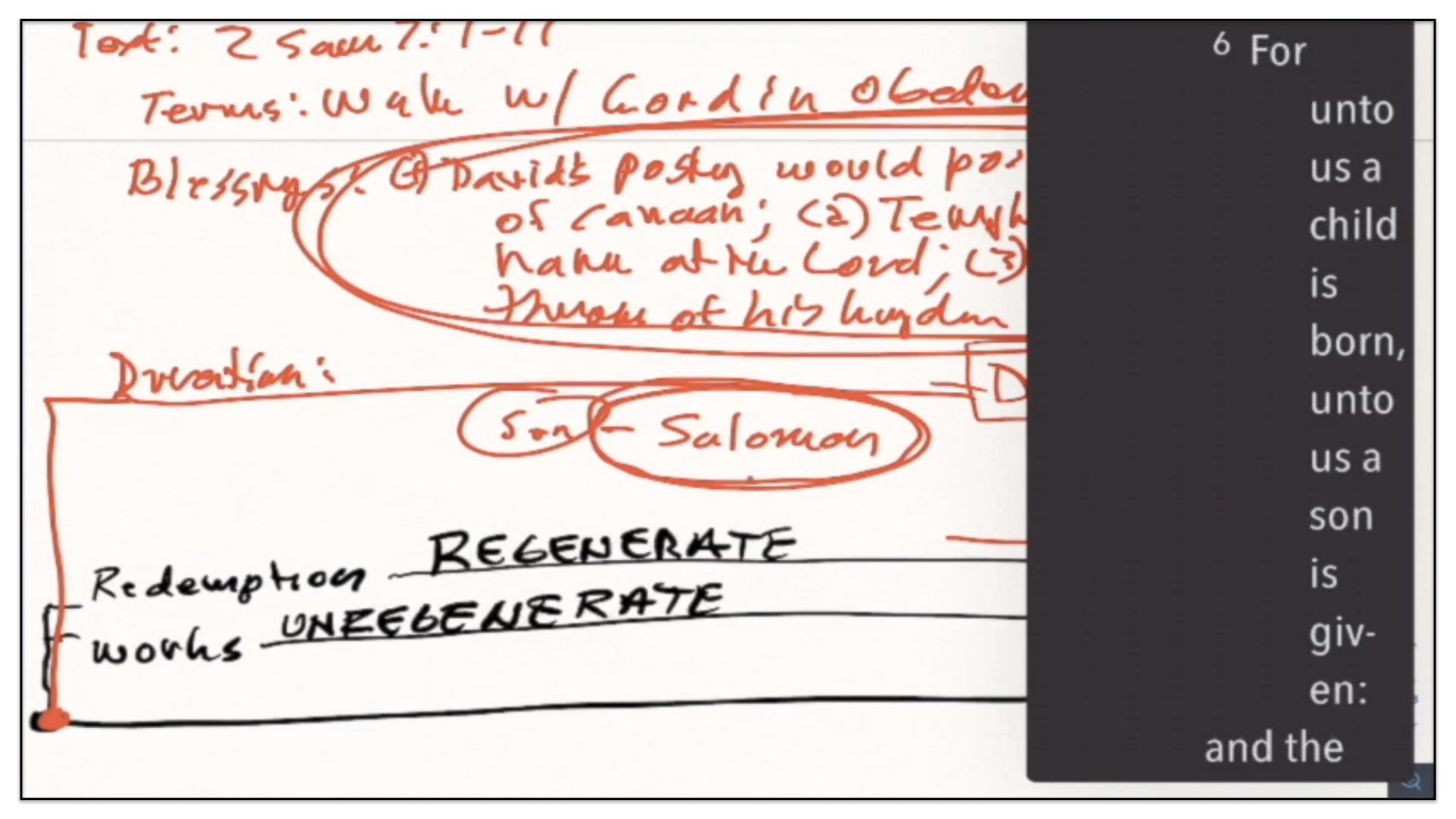 Now, on this point, I do want to read for you several scriptures. The first of these is found in the Old Testament. I’ll be reading for you from Isaiah chapter 9 and I want to begin in verse 6. I’ve made mention of this to you before—the Bible App I use for the on-screen notes, they have a system in their application where it automatically indents a passage of scripture it deems to be part of a poetic statement and I wish they didn’t do that, but they do and that means we’re forced on the edge of the screen to have to read the words in the following format; my apologies of to you for that, but you at least get to see the words as I read them—this is Isaiah chapter 9 and verse 6. And we read, “For unto us a child is born, unto us a son is given: and the government shall be upon his shoulder: and his name shall be called Wonderful, Counsellor, The mighty God, The everlasting Father, The Prince of Peace. Of the increase of his government and peace there shall be no end, upon the throne of David, and upon his kingdom, to order it, and to establish it with judgment and with justice from henceforth even for ever. The zeal of the LORD of hosts will perform this.” What I believe that refers to by prophecy, is that the Davidic Covenant itself comes to an end, but the Messiah Himself enters upon His eternal work, which falls not under the Davidic Covenant, but under the Covenant of Redemption. For remember, the coming Messiah is under the Covenant of Redemption, that’s ultimately why the Messiah is coming is because God the Father has given His elect people to His Son, His Son has agreed to redeem them and to that end the Father will send forth His Son, made of a woman, made under the law, to redeem His people that are under the law and in their sins. And that’s the whole purpose for the Messiah coming into the world. And you see it’s all linked to the Covenant of Redemption.